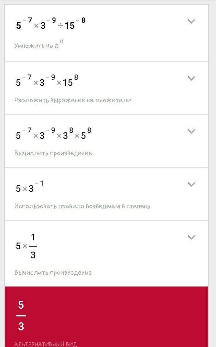 5 в минус 7 степени умножить на 3 в минус 9 степени разделить на 15 в минус 8 степени