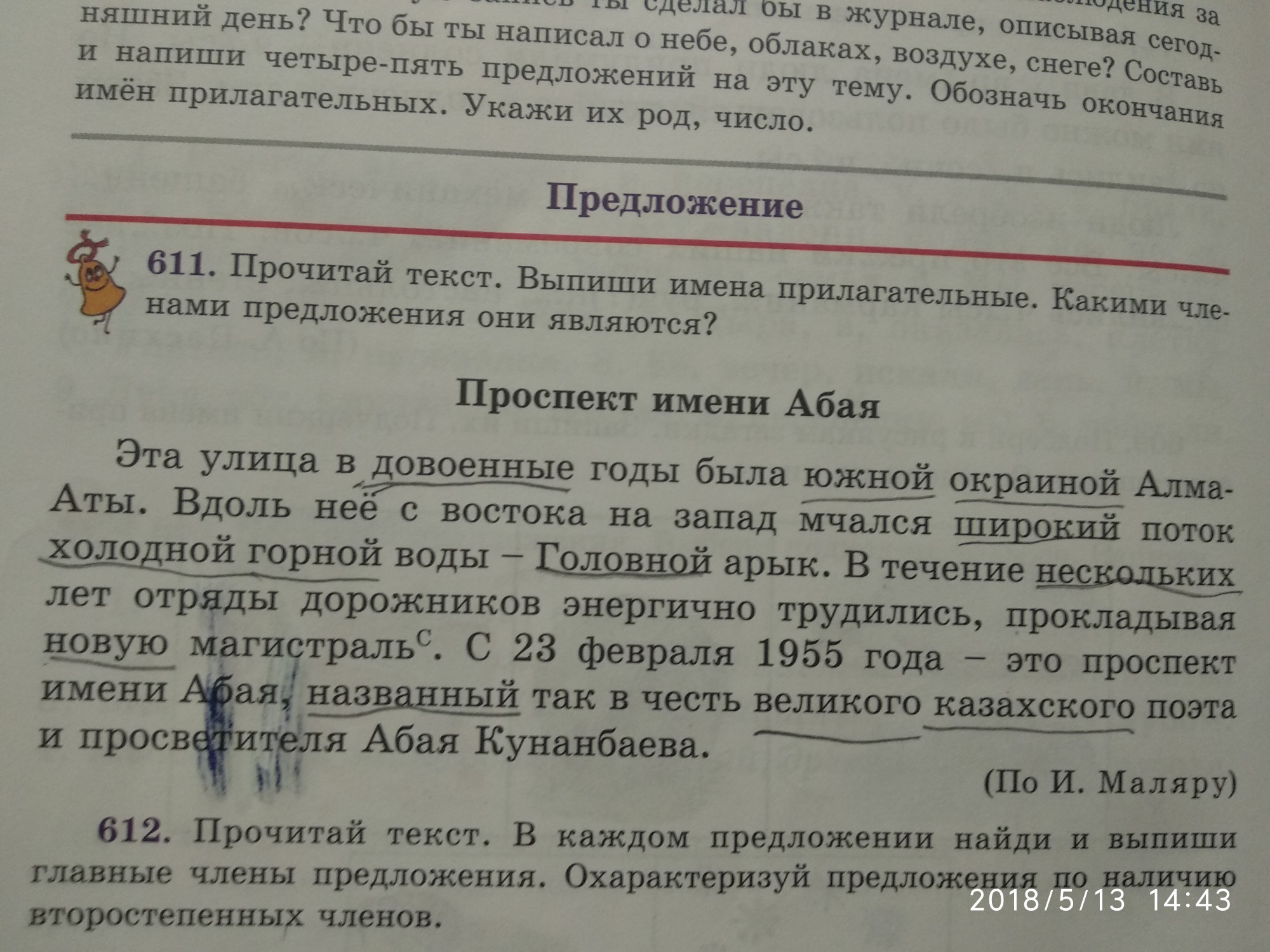 Имена прилагательные: довоенные, южной, широкий, холодной, горной, Головной, нескольких, новую, названный, великого, казахского- определение.