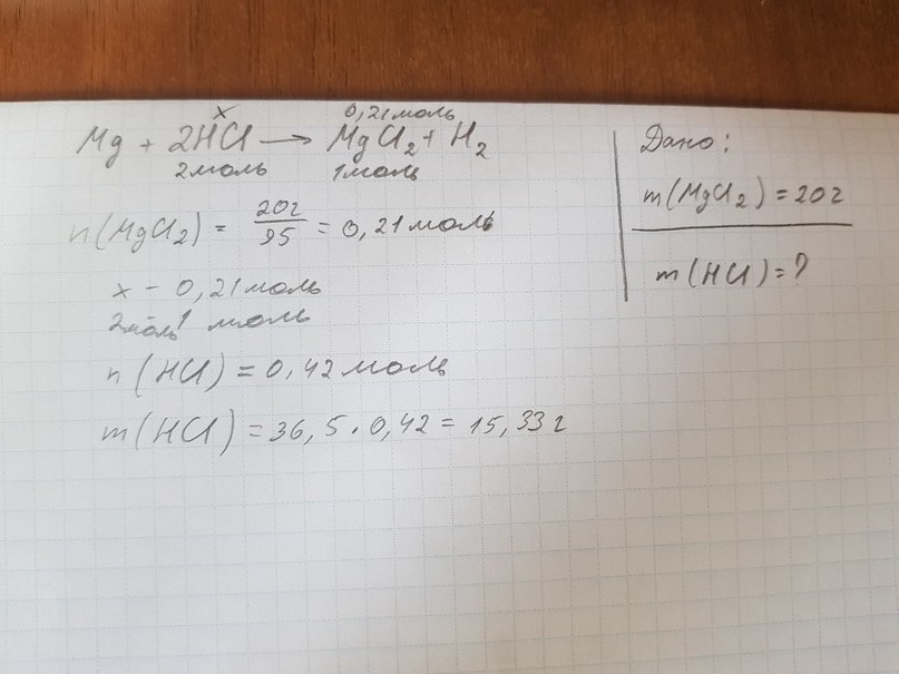 вычислить массу соляной кислоты, необходимой для получения 20 г хлорида магния (при взаимодействии магния с соляной кислотой)