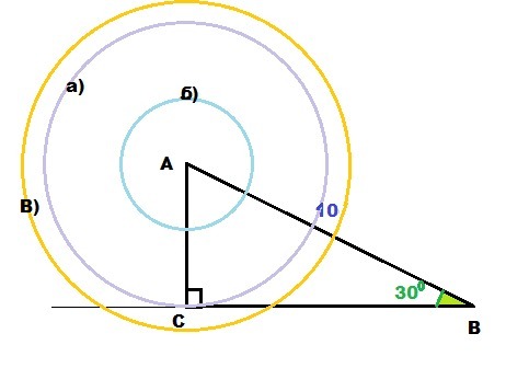 АСВ (∠C = 90°) АВ = 10, ∠ABC = 30°. С центром в точке А проведена окружность. Каким должен быть ее радиус, чтобы: а) окружность касалась прямой ВС; b) окружность не имела общих точек с прямой ВС; c) окружность имела две общие точки с прямой ВС? пожалуйста если сможете постройте мне очень срочно надо. Дам 20 балов