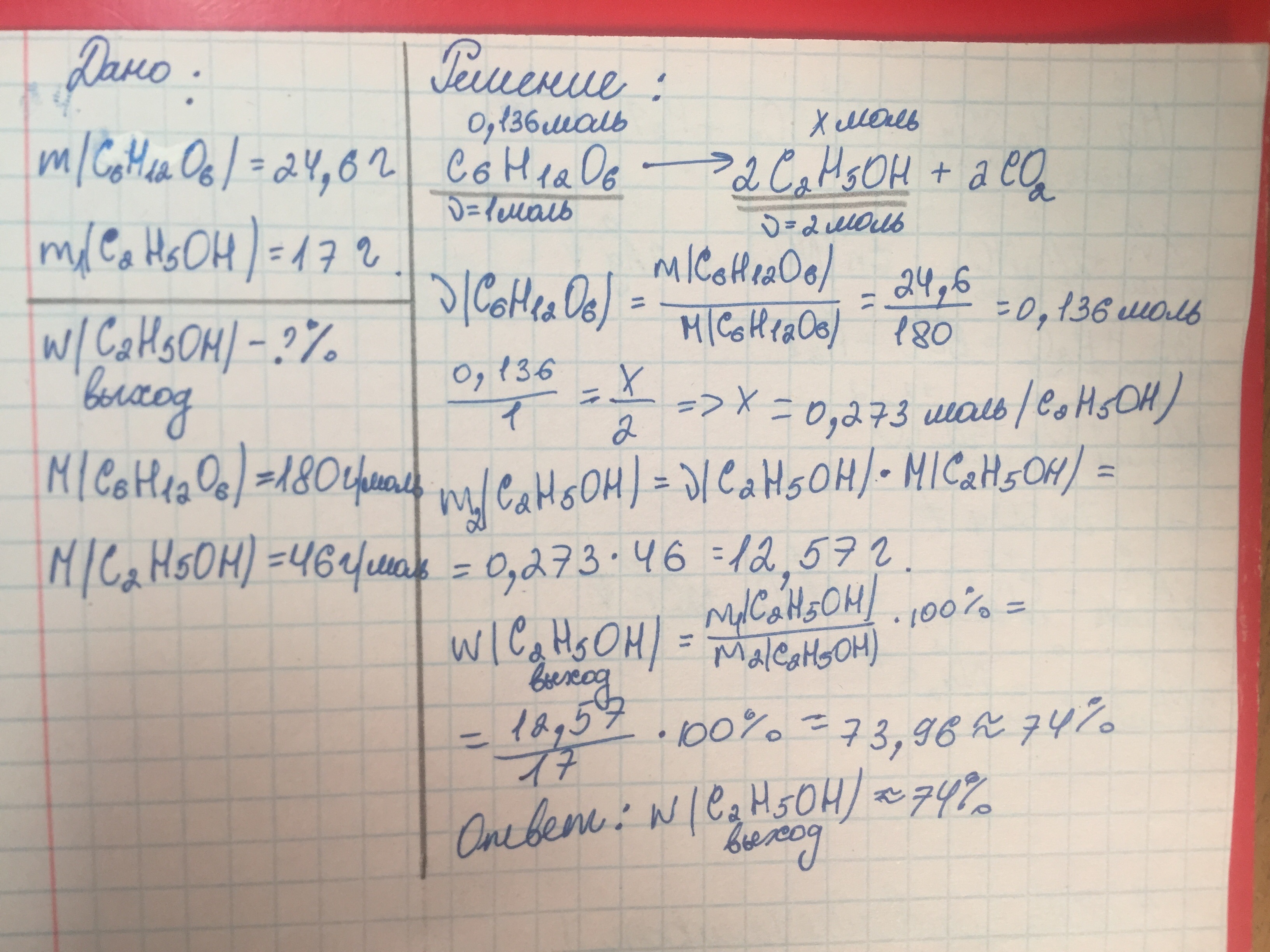 При спиртовом брожении Глюкозы массой 24, 6Г получили 17 г этилового спирта.Расчитаете массовую долю выхода продукта реакции