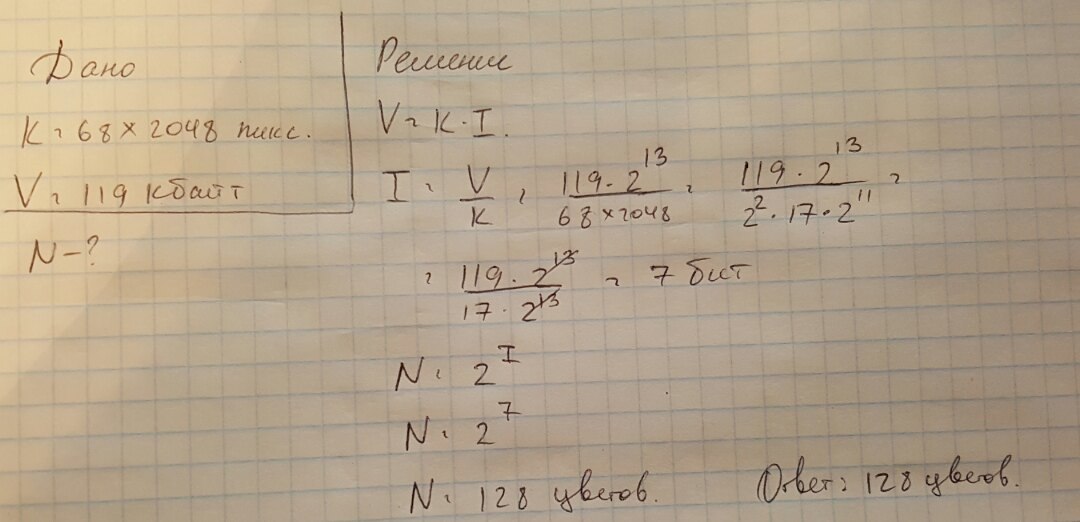 Рисунок размером 68 на 2048 пикселей занимает в памяти 119 Кбайт (без учёта сжатия). Найдите максимально возможное количество цветов в палитре изображения.