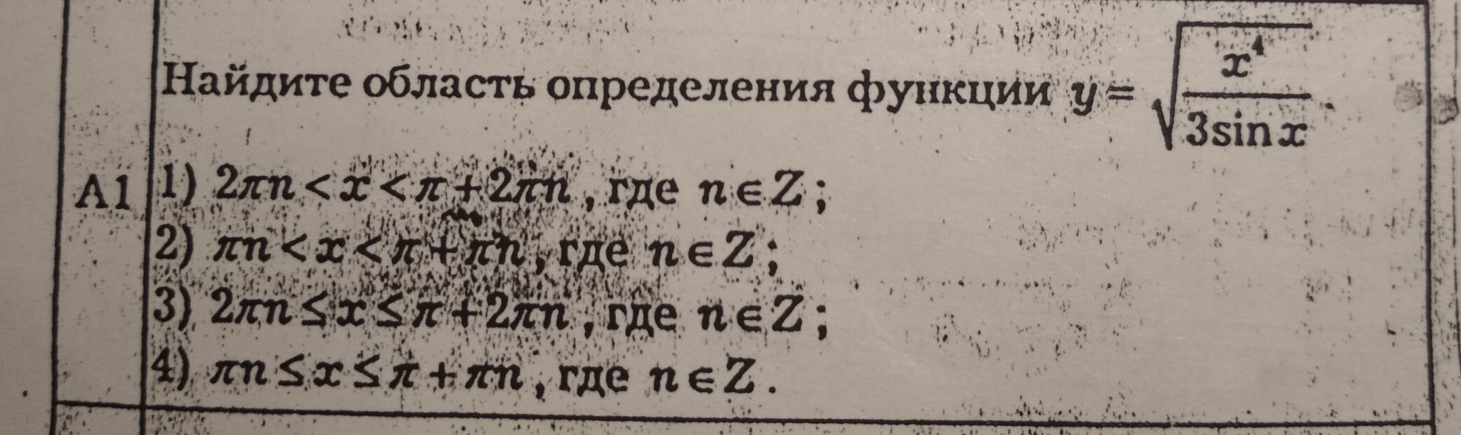 sqrt{ frac{ x^{4} }{3Sinx} } \\  left { {{ frac{ x^{4} }{3Sinx} } geq 0 atop {Sinx neq 0}} right.\\Sinx textgreater  0 \\ 2 pi n textless  x textless   pi +2 pi n
