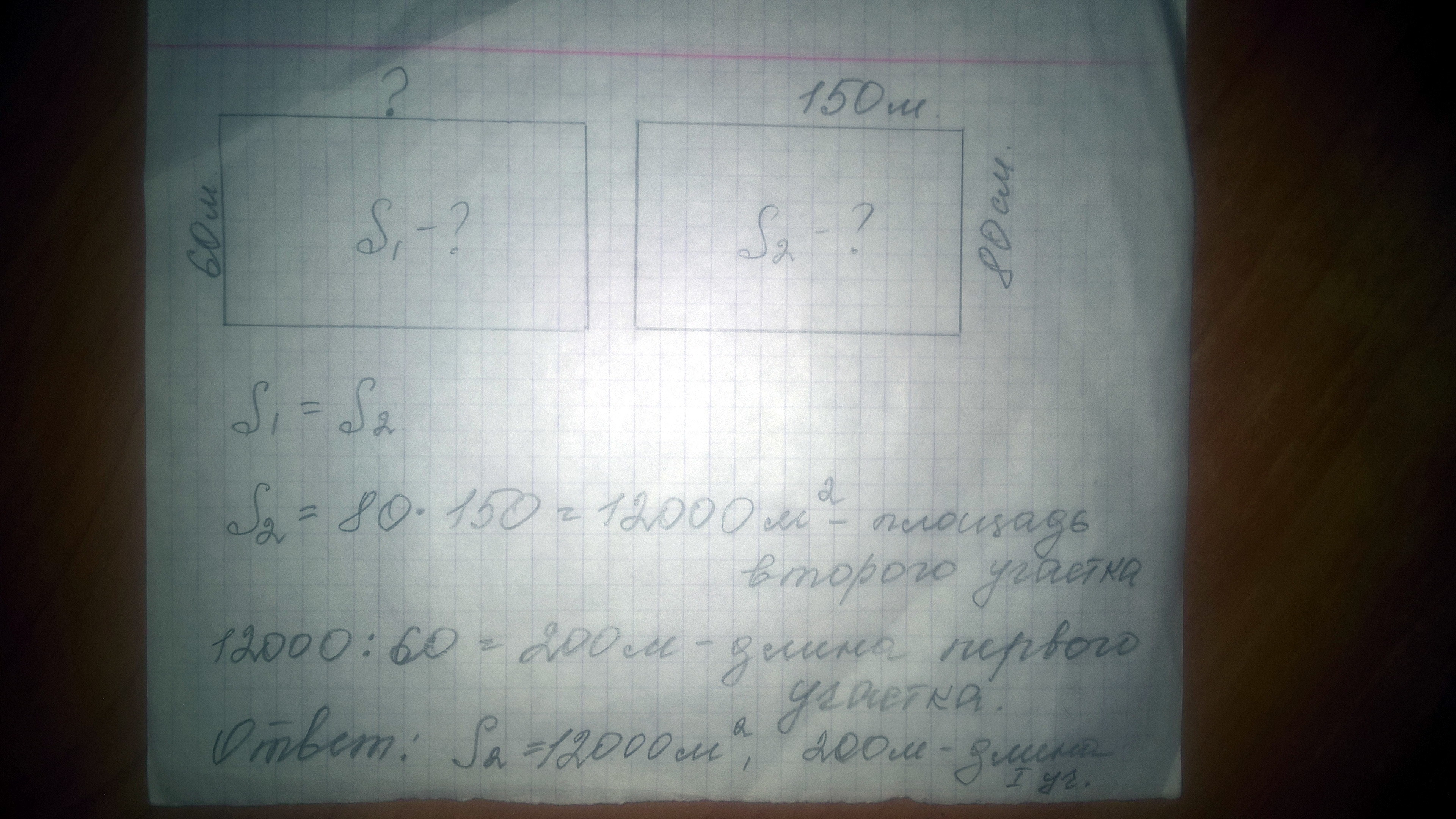 в опытах участка имеют одинаковую площадь. Длина первого участка 60 м, а ширина 2 80 см Найти длины первого участка, если известно, что длина второго участка 150 м. Сделай по задаче чертеж и реши его.помогите срочнооо