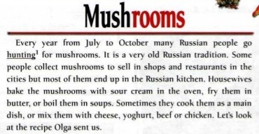Каждый год с июля по октябрь много русских людей ходят на охоту за грибами.Это очень старая русская традиция.Многие люди собирают грибы и продают их в магазины и рестораны города,но большинство из них попадают на русскую кухню.Домохозяйки запекают грибы со сметаной в духовке, обжаривают их в масле или варят их в супах.Иногда они готовят их с рыбой или добавляют в них сыр, йогурт, говядину или курицу.Давайте посмотрим какой рецепт прислала для нас Ольга.