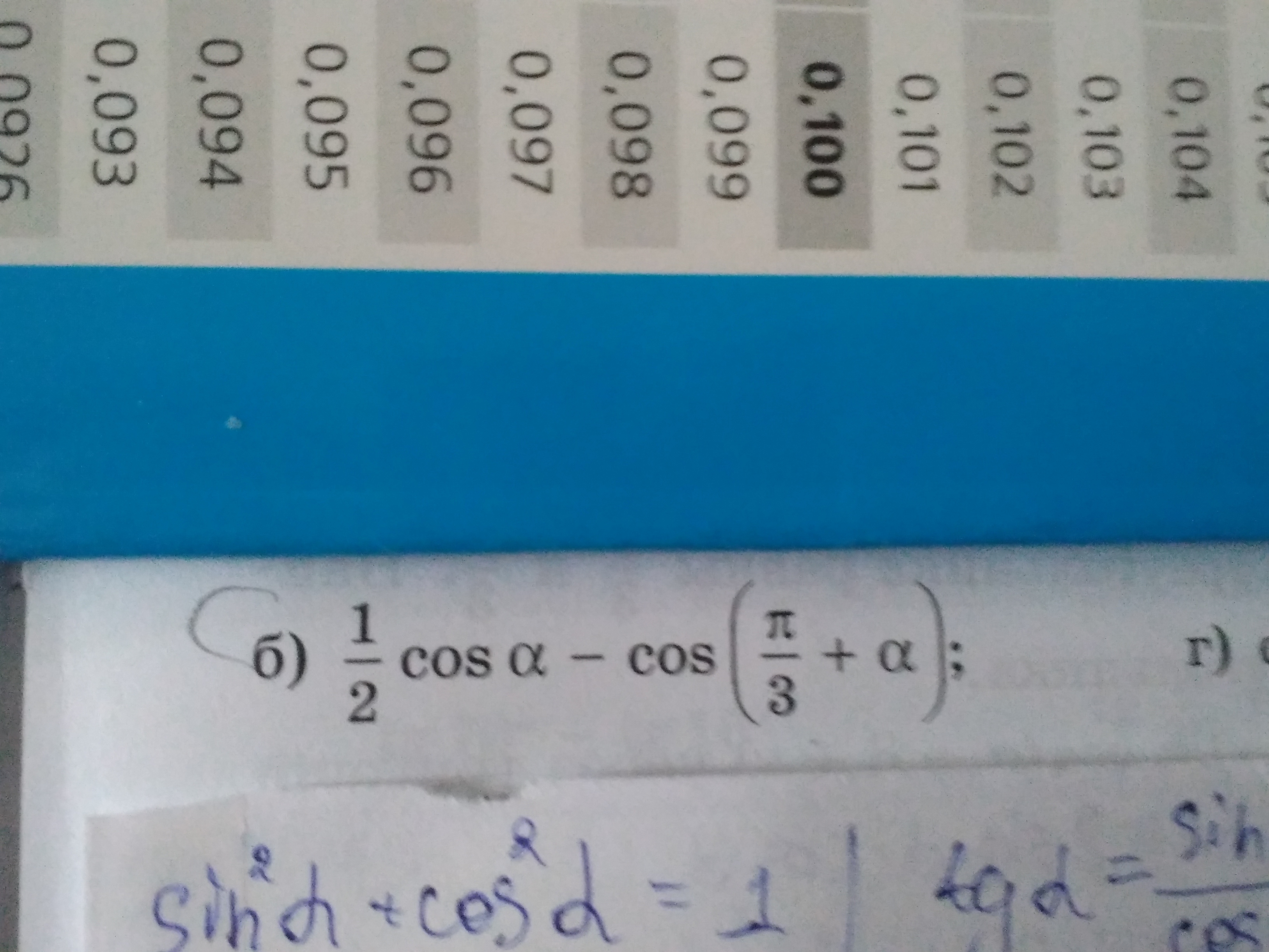 Дорешиваем cos(π/3)*cos(a)-(cos(π/3)*cos(a)-sin(a)*sin(π/3))=cos(π/3)*cos(a)-cos(π/3)*cos(a)+sin(a)*sin(π/3)=sin(a)*sin(π/3)=1/2*sin(a)