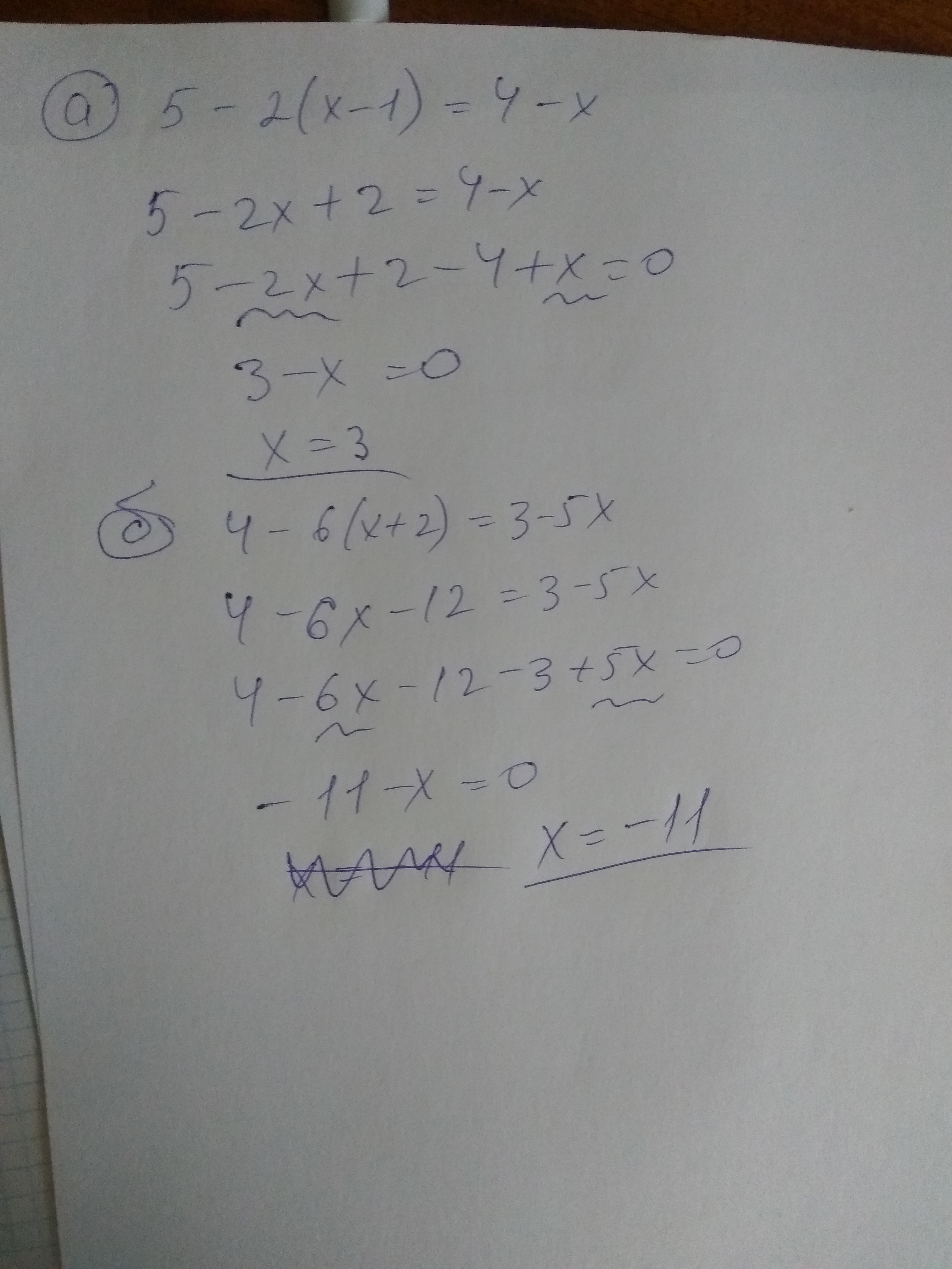 помогите решить - 7 класс Линейное уравнение с одной переменной- Решите уравнение а) 5 – 2(x – 1) = 4 – x; б) 4 – 6 (x + 2) = 3 – 5x