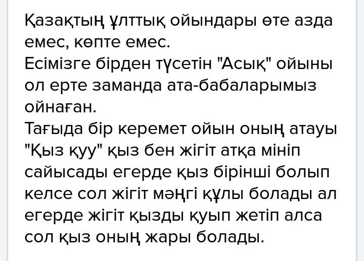 казахские национальных игр не мало и не много.игра Асык сразу напоминает что в эту игру играли наши предкие.Еще одна замечательная игра Кыз ку , девушка и парень на лошади соревнуются если девушка первая придет то тот парень во веке будет рабом а если парень девушку догонит то эта девушка станет его женой.