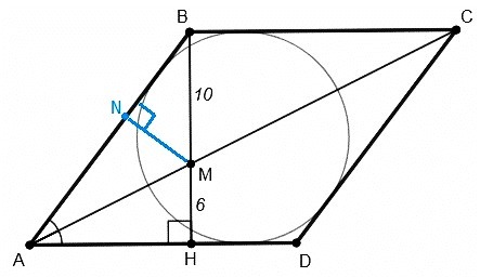 Точка M лежит на биссектрисе, равноудалена от сторон угла, MN=MH=6.