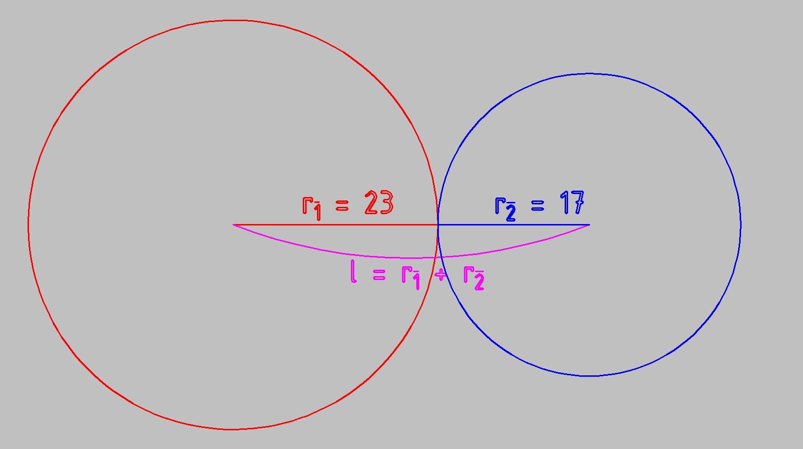 найдите расстояние между центрами двух окружностей в случае внешнего касания если их радиусы 23 и 17 см