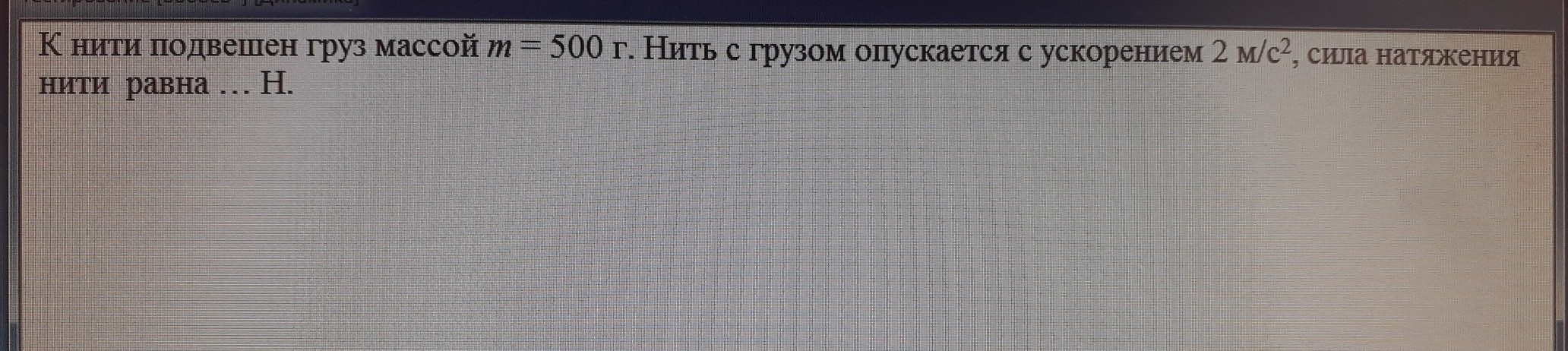 к нити подвешен груз массой m=500г. Нить с грузом опускается с ускорением 2 м/с2,сила натяжения нити равна...Н.