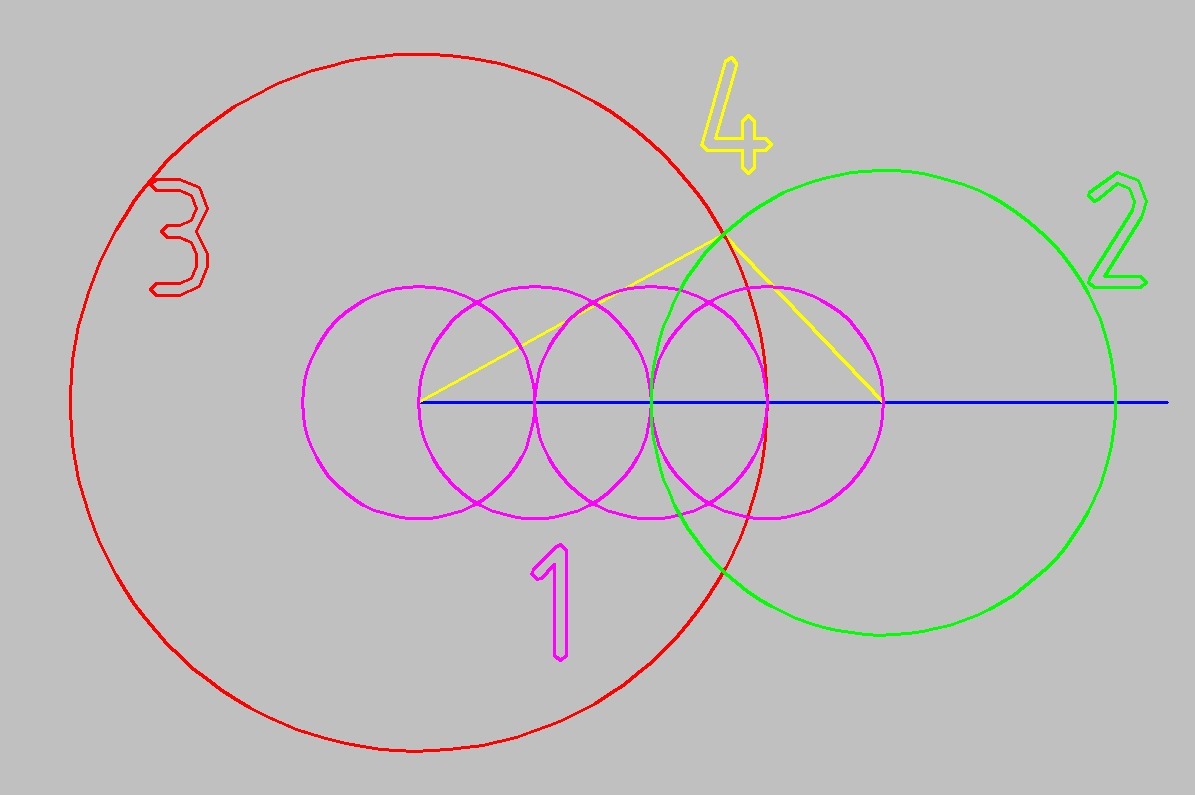 1 на ней строим 4 окружности радиуса 1, так, чтобы следующая начиналась на правой точке пересечения предыдущей окружности с прямой. При этом на прямой получается построен отрезок длиной 4