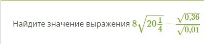 8√(20 ¹/₄) - (√0,36/√0,01)= 8√20,25 - (0,6/0,1) = 8 * 4,5 - 6 =
