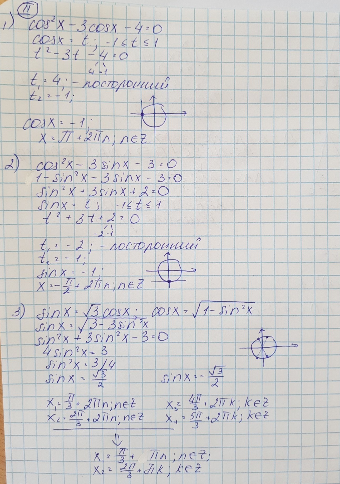 Первые 2 номера решаются заменой. В третьем применяется основное тригонометрическое тождество: sin^2x+cos^2x=1.