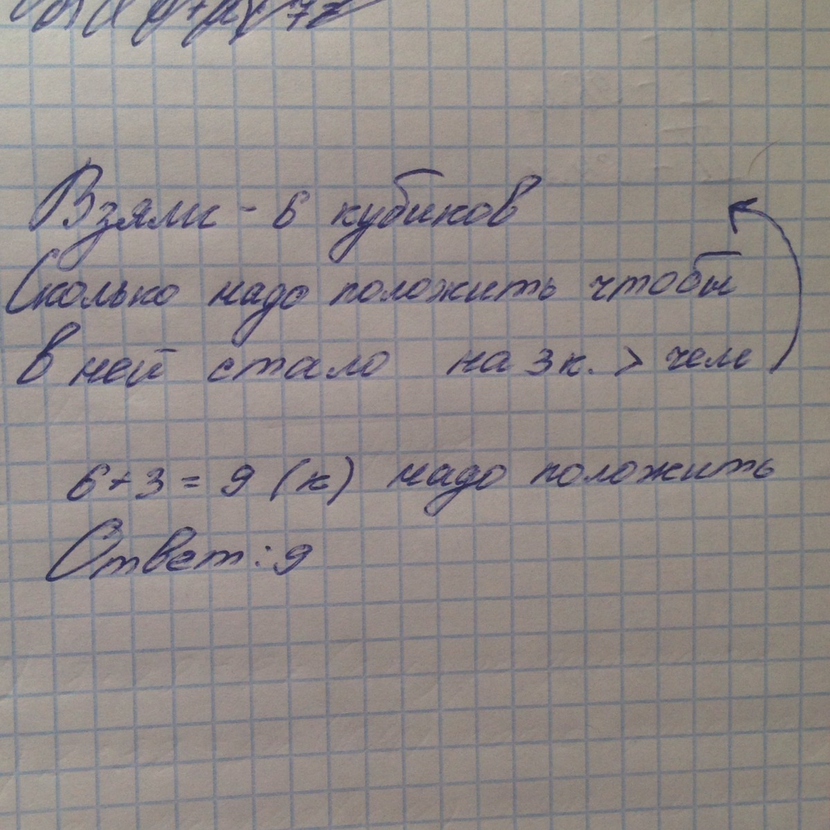 Из коробки взяли 6 кубиков. Сколько кубиков надо положить в коробку, чтобы в ней стало на 3 кубика больше, чем было сначала? Как правильно записать условие!???Краткая запись!???