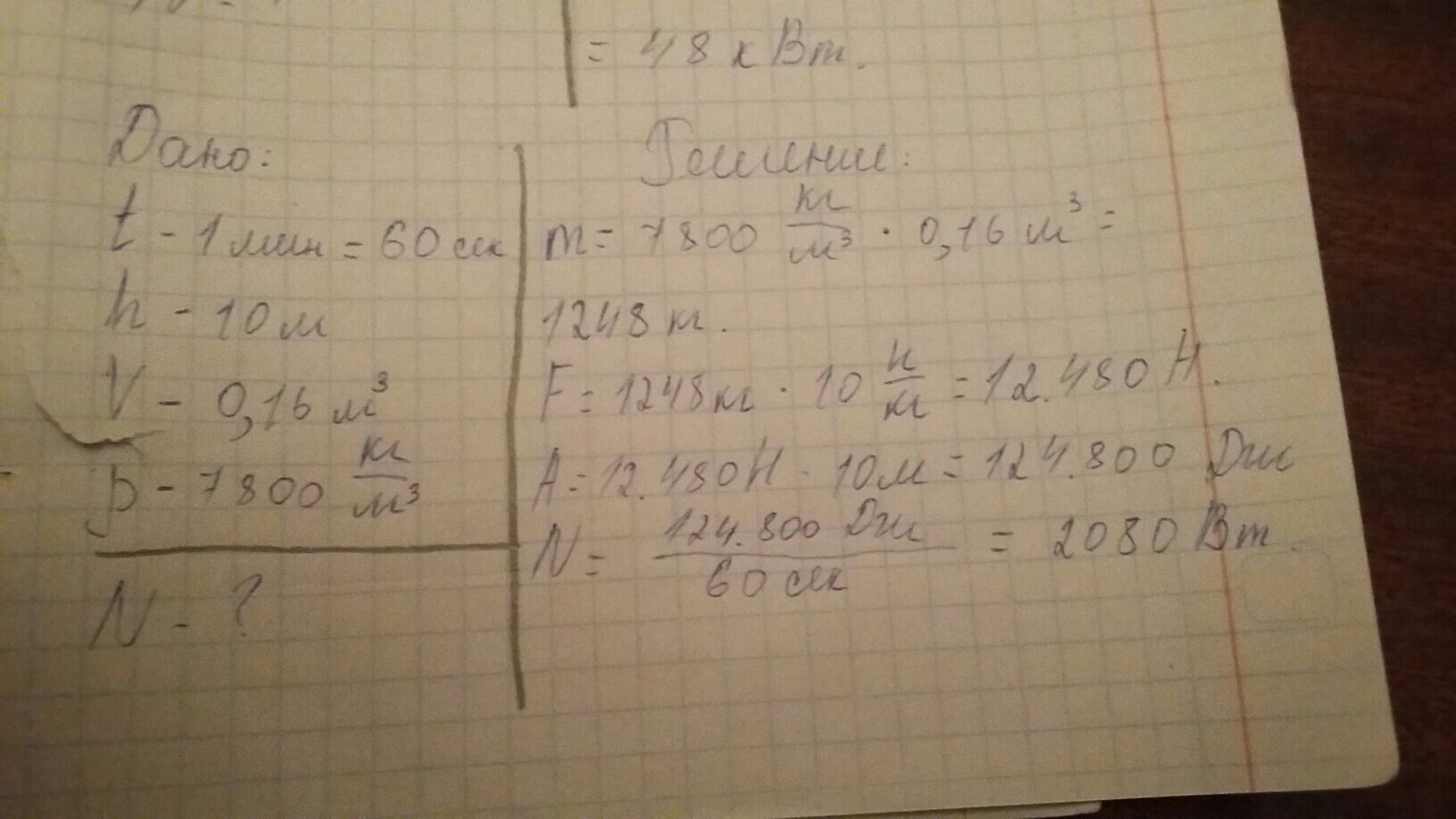 Какова мощность подъемного крана , если за 1 минуту он поднимает на высоту 10м стальной брус объемом 0,16м3. Плотность стали 7800кг/м3
