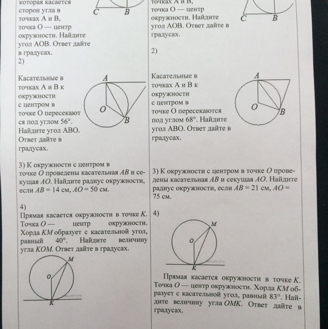 Угол между касательной и хордой равен половине дуги, которую он заключает, значит, дуга АВ равна 112°. Угол AOB — центральный, поэтому он равен дуге, на которую опирается, следовательно, равен 112°.