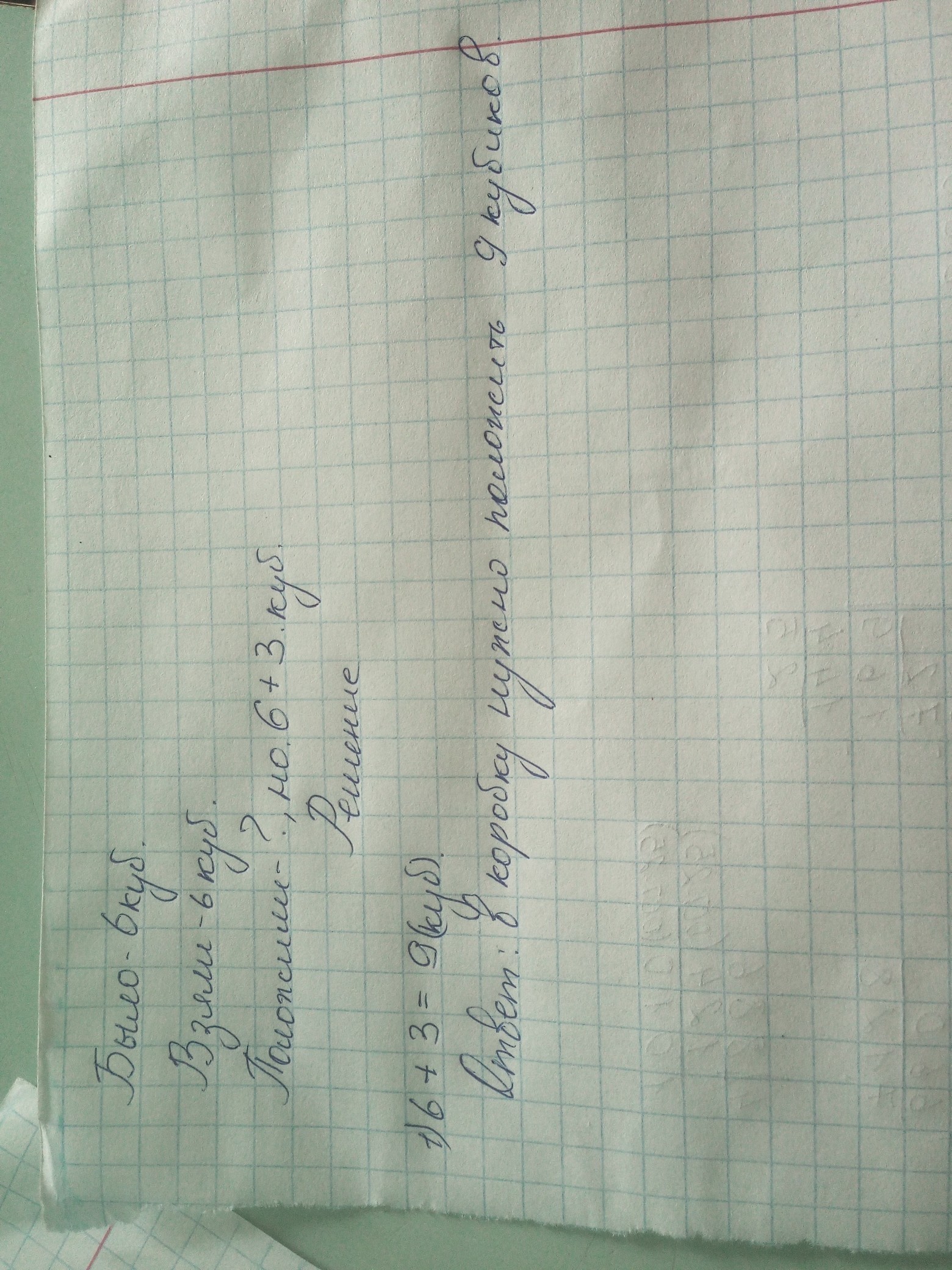 Из коробки взяли 6 кубиков. Сколько кубиков надо положить в коробку, чтобы в ней стало на 3 кубика больше, чем было сначала? Как правильно записать условие!???Краткая запись!???