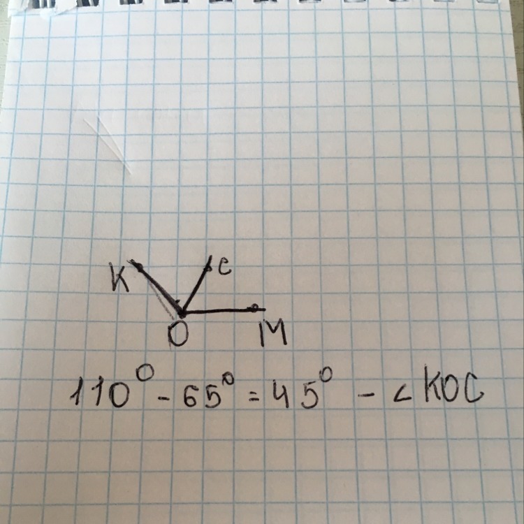 угол KOM=110 градусов, угол COM=65 градусов. OC -луч, надо найти угол KOC. пожалуйста в тетради!