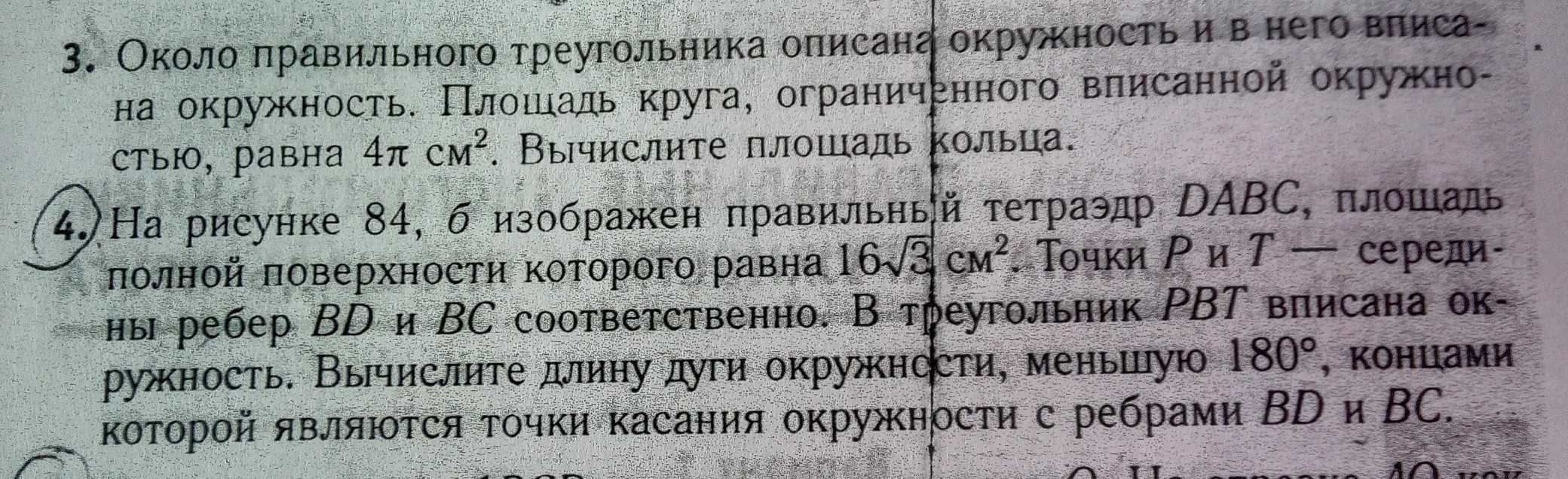 Поскольку других размеров не дано, надо думать, данный тетраэдр - правильный. Следовательно, все его 4 грани - правильные треугольники, а площадь одной грани равна 16√3:4=4√3Площадь правильного треугольника находят по формулеS=(а²√3):44√3=(а²√3):4, откуда а=4. т.е. ребро данной пирамиды равно 4. Тогда треугольник ВРТ тоже правильный, т.к. Р и Т - середины ребер, и стороны треугольника ВРТ равны2. Пусть точки касания вписанной в него окружности будут на ребре BD -К, на ребре ВС -НВ четырехугольнике КВНО углы при К и Н - прямые, угол В=60°. Т.к. сумма углов четырехугольника равна 360°, а сумма углов К и Н=90°*2=180°, то угол КОН равен 180°- 60°=120°.Т.е. дуга КН=120°, и ее длина равна 360°:120°=одной трети длины вписанной в треугольник ВРТ окружности. Радиус вписанной в правильный треугольник окружности а:2√3Радиус данной вписанной окружности 2:2√3=1/√3 смДлина этой окружности L=2πr=2π:√3 смДлина дуги градусной мерой 120° равна одной трети длины всей окружности.Следовательно, длина дуги КН=(2π:√3):3 или (2π√3):9 см