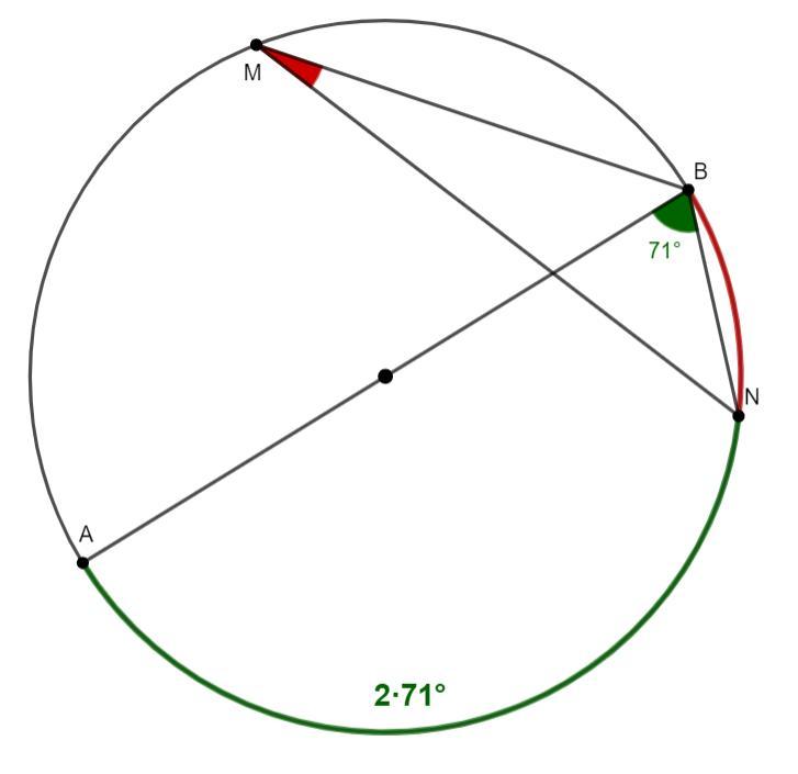 ∪AN=2·∠NBA=2·71°=142° и ∠NMB=∪NB:2.