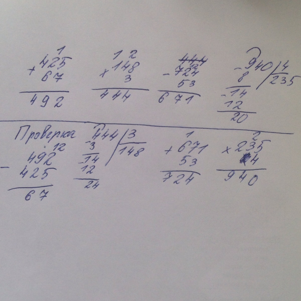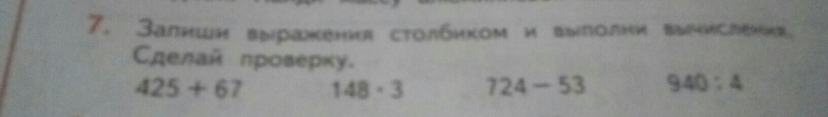 запиши выражения столбиком и выполнивычисленич сделай проверку. 425+67. 148×3. 724-53. 940÷4