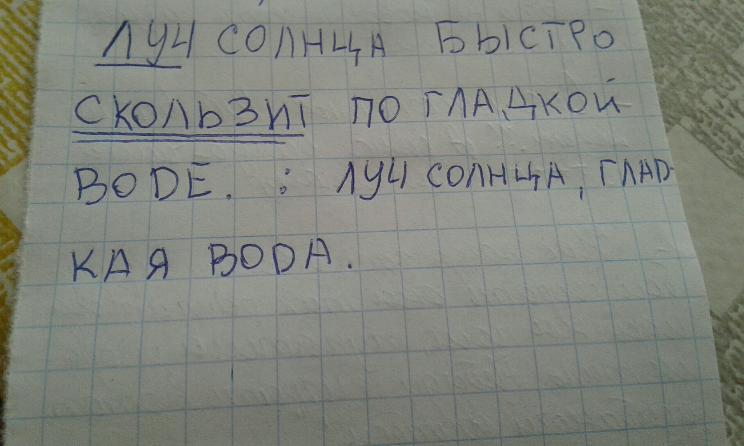 подчеркнуть главные члены предложения выписать словосочетания указать части речи: луч солнца быстро скользит по гладкой воде. внезапно на темном небе появилась яркая молния