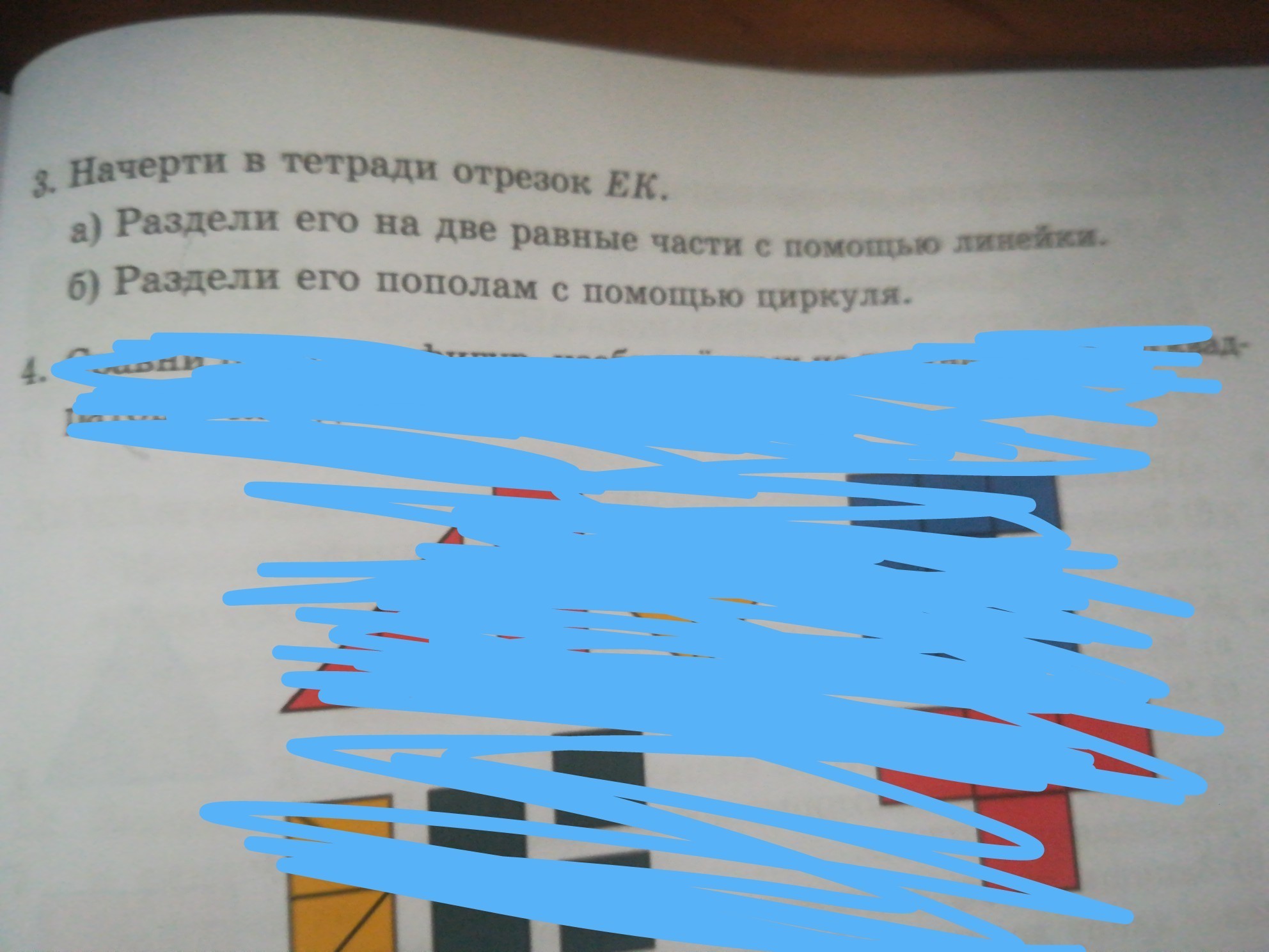берёшь циркуль и проводишь 2 окружности с одинаковым радиусом который Точно больше чем половина и ставишь точки в местах где они пересекаются эти точки и есть середина отрезка дальше проводишь линию между этими двумя точками и там где это линия пересекается с данным отрезком там середина