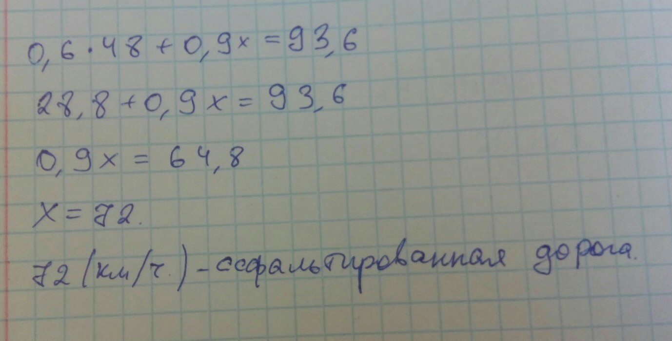 2) Автомобиль ехал 0,9ч. по асфальтированной дороге и 0,6ч. по грунтовой, проехав всего 93,6км. С какой скоростью двигался автомобиль по асфальтированной дороге, если по грунтовой он ехал со скоростью 48км/ч?