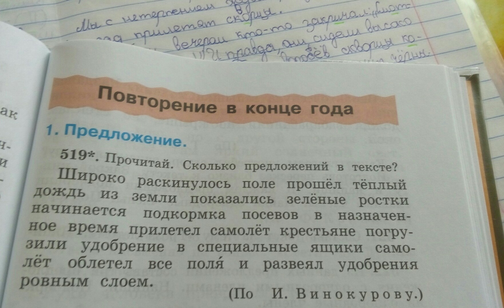 Широко раскинулось поле. Прошёл теплый дождь. Из земли показались зелёные ростки. Начинается подкормка посевов. В назначенное время прилетел самолёт. Крестьяне погрузили удобрение в специальные ящики. Самолёт облетел все поля и развеял удобрения ровным слоем.