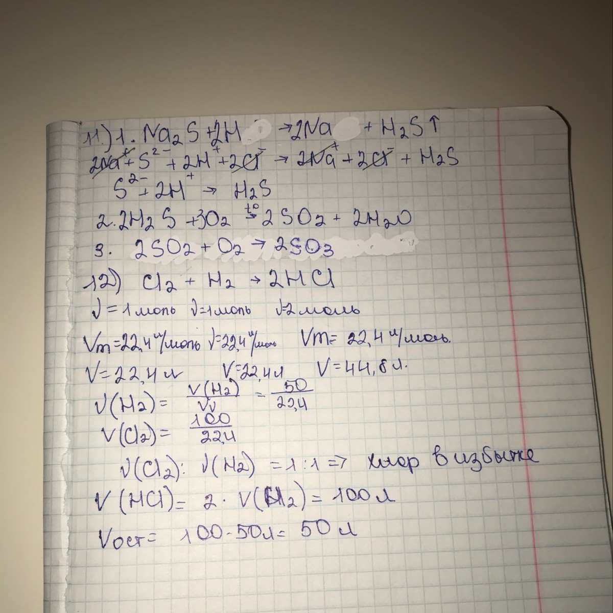 12. Рассчитайте объем хлороводорода, который получится при взаимодействии 100 л хлора и 50 л водорода.