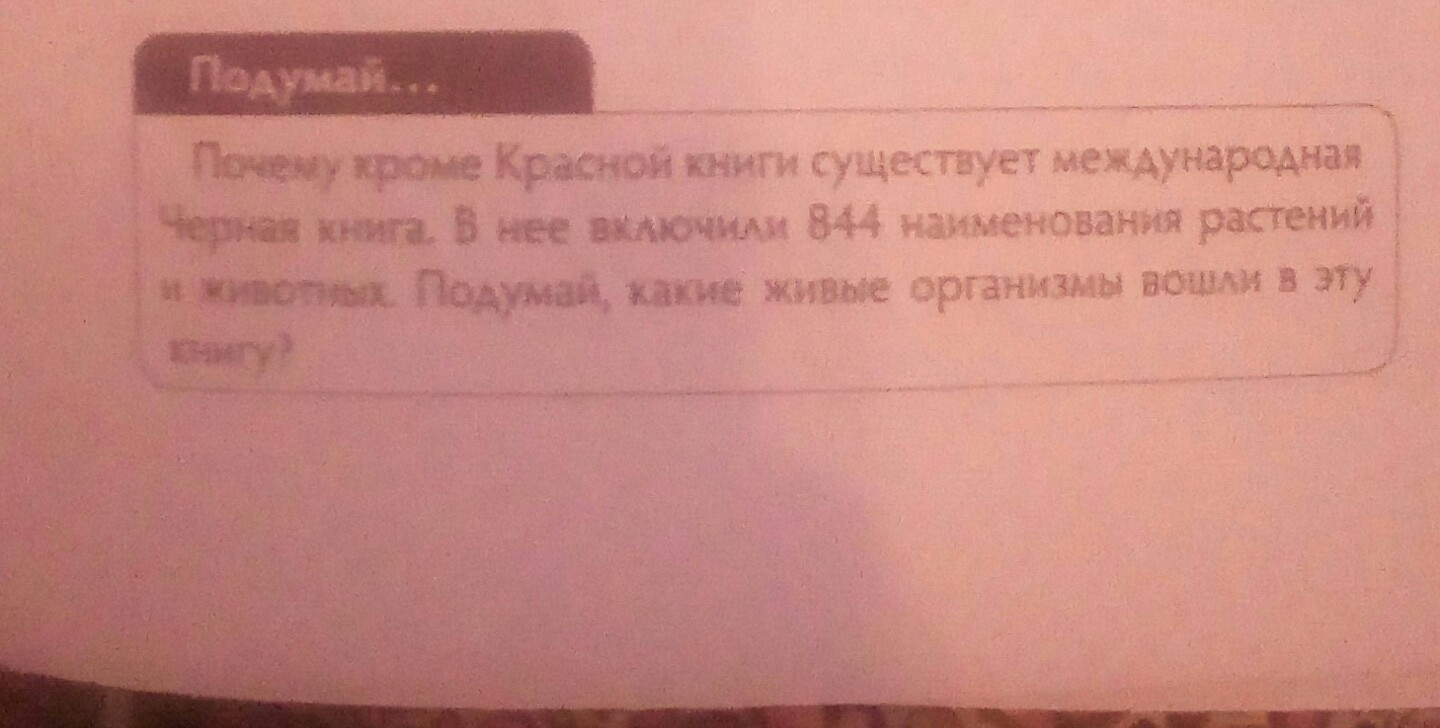ПОТОМУ ЧТО: В МИРЕ ЕСТЬ РЕДКИЕ РАСТЕНИЯ/ЖИВОТНЫЕ/ПТИЦЫ/МЛЕКОПИТАЮЩИЕ/НАСИКОМЫЕ И Т.Д. ДЛЯ НИХ СДЕЛАЛИ КРАСНУЮ КНИГУ,А ЕСТЬ УЖЕ НЕ СУЩЕСТВУЮЩИЕ РАСТЕНИЯ/ЖИВОТНЫЕ/ПТИЦЫ/МЛЕКОПИТАЮЩИЕ/НАСЕКОМЫЕ И Т.Д. ДЛЯ НИХ ЕСТЬ ЧЁРНАЯ КНИГА.
