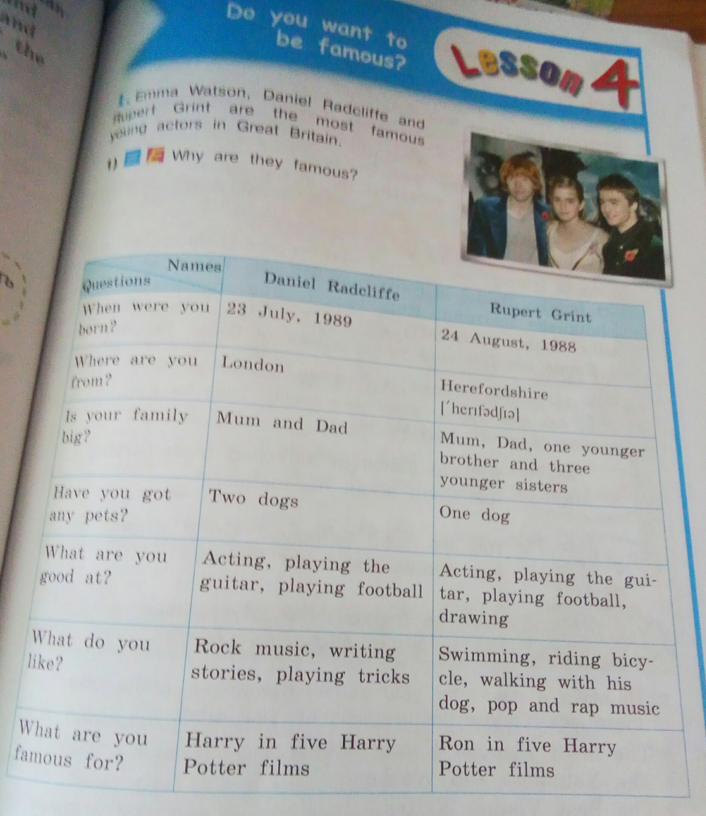 Rupert Grint was born 24 August, 1988. He lives in Herefordshire. His family is very big, he has mum, dad, younger brother and three younger sisters. He has one dog. Rupert Grint is very good at acting, playing the guitar and drawing. He likes to swim, ride a cycle. He is famous for his role as Ron in five Harry Potter films.