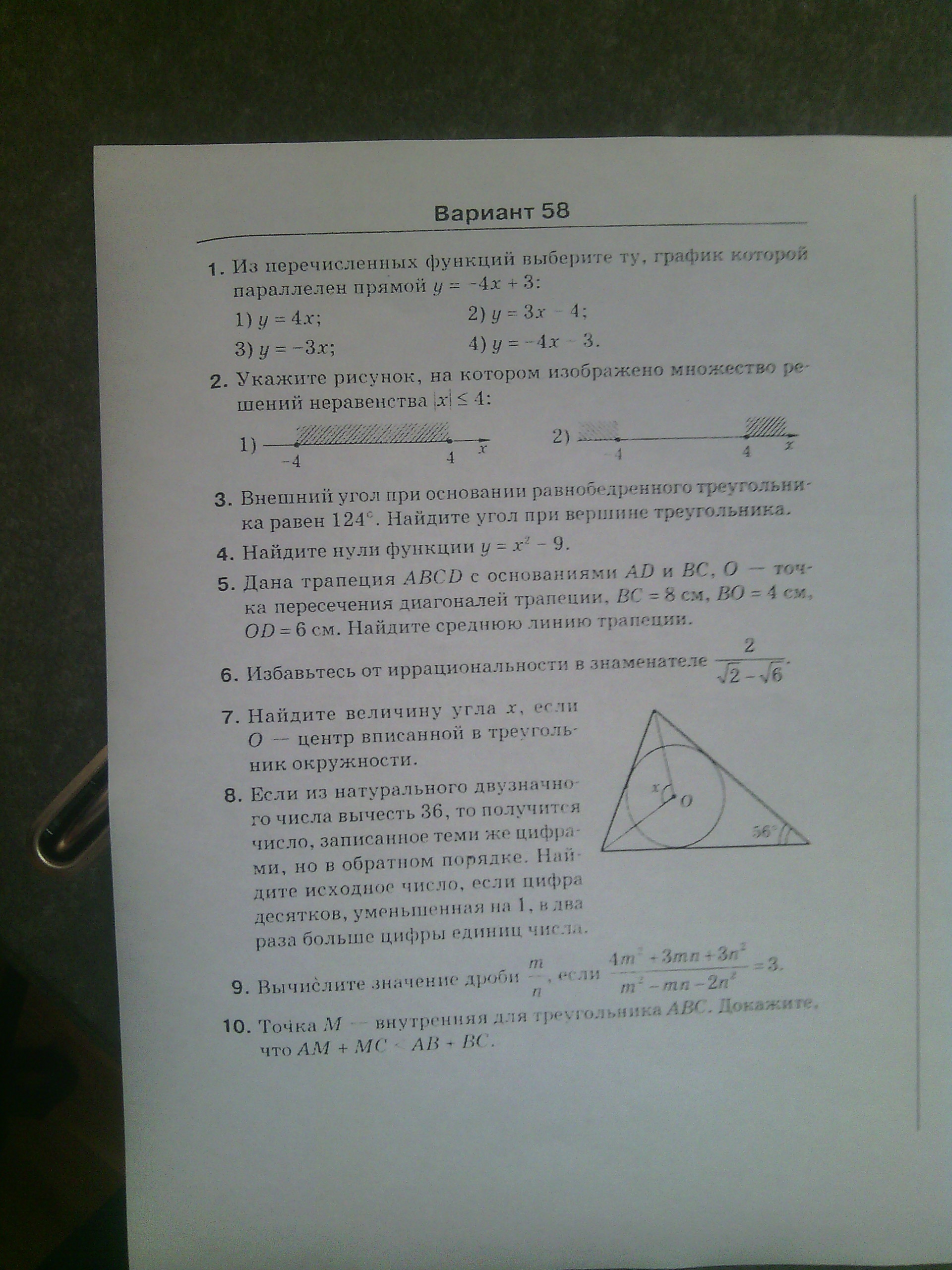 3-тк угол внешний то внутренний равен 180- угол внешний,тобишь угол 124 градуса=56 градусов.Т.к треугольник равнобедренный,то и 2 угол при основании равен 56.Сумма углов треугольника равна 180 градусам,а нам известны 2 угла,следовательно 180-(56+56)=68 градусов