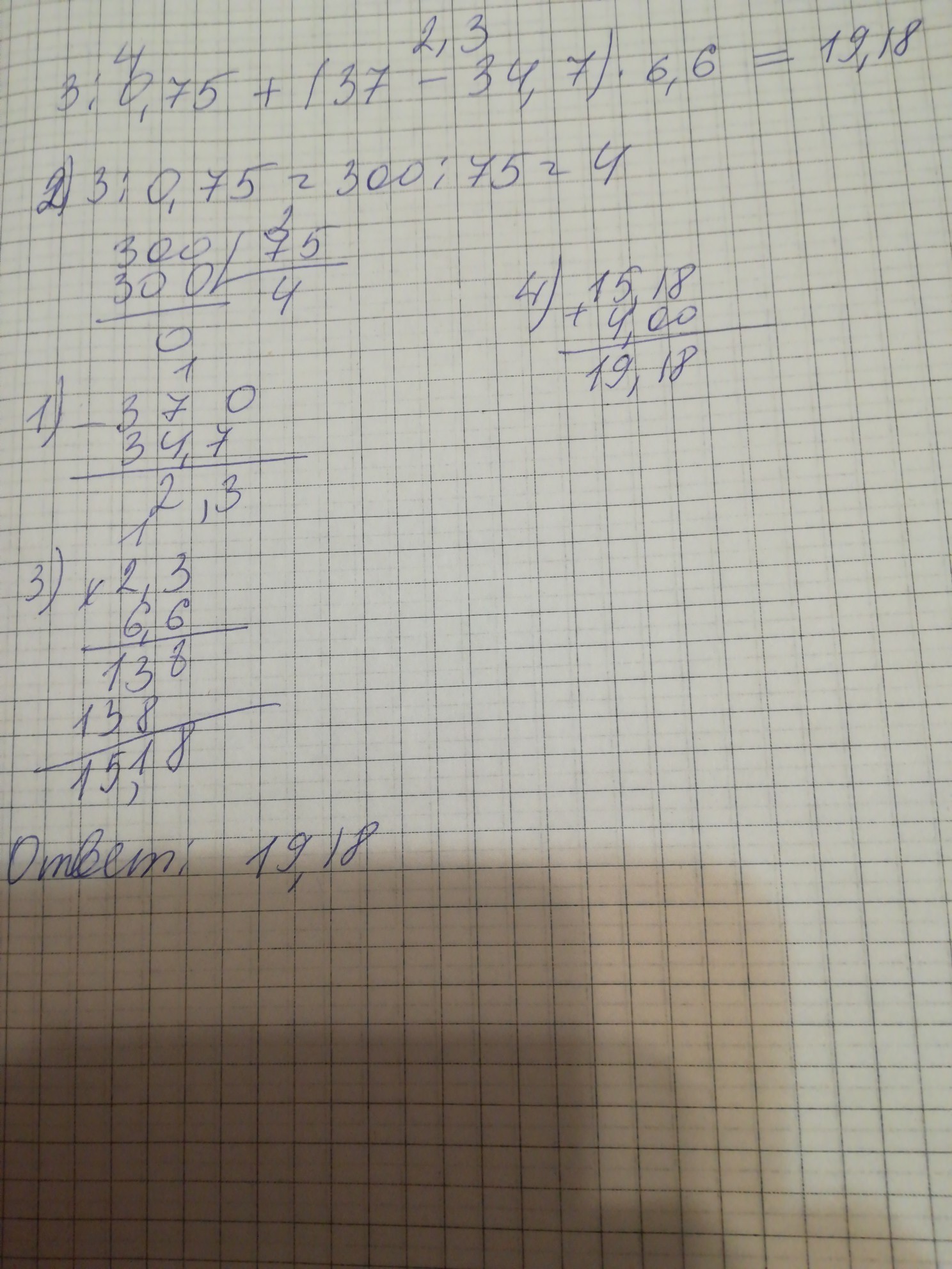 помогите пожалуйста нужно решить пример по действиям желательно в столбик 3:0,75+(37-34,7)*6,6=????