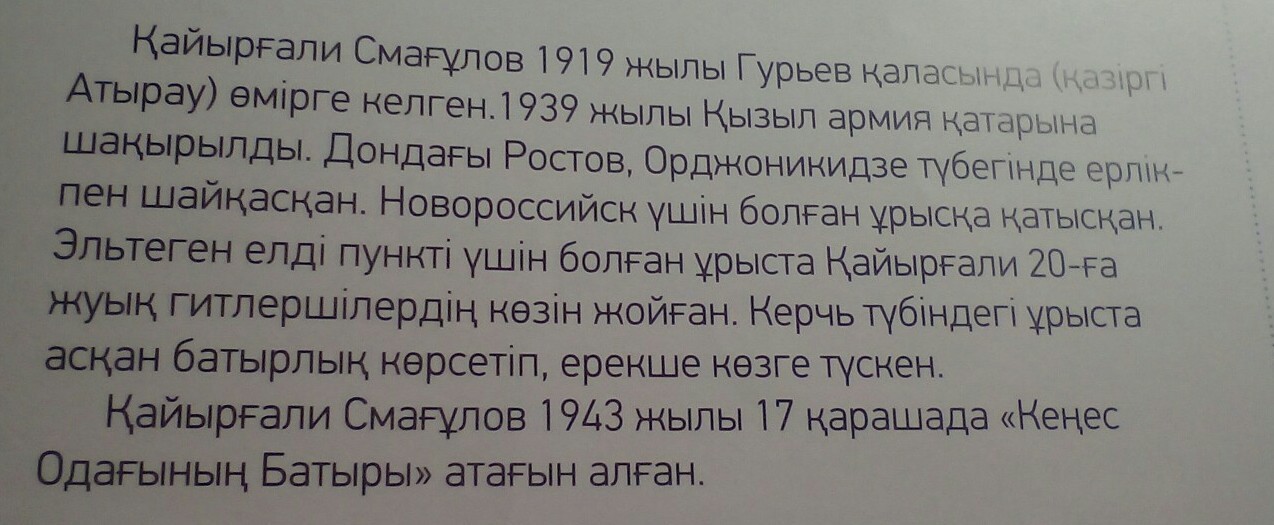 Зат есім(существительные):Қайырғали Атырау,Армия,Эльтеген,Керчь,батырлық