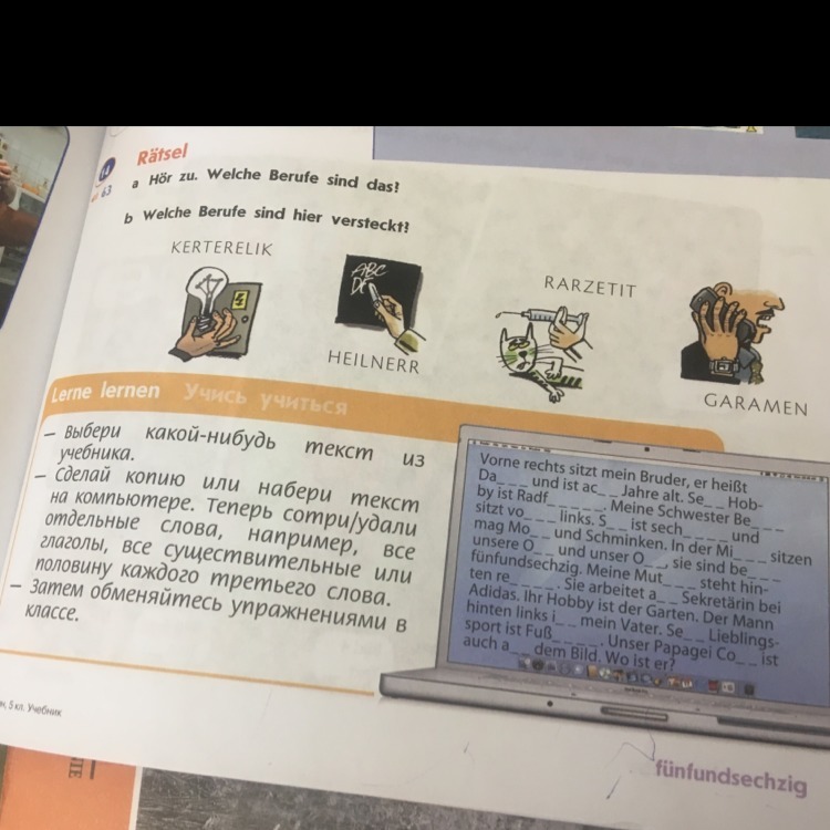 Vorne rechts sitzt mein Bruder, er heißt David und ist acht Jahre alt. Sein Hobby ist Radfahren. Meine Schwester Beate sitzt vorne links. Sie ist sechzehn und mag Mode und Schminken. In der Mitte sitzen unsere Oma und unser Opa, sie sind beide fünfundsechzig. Meine Mutter steht hinten rechts. Sie arbeitet als Sekretärin bei Adidas. Ihr Hobby ist der Garten. Der Mann hinten links ist mein Vater. Sein Lieblingssport ist Fußball. Unser Papagei Cony ist auch auf dem Bild. Wo ist er?