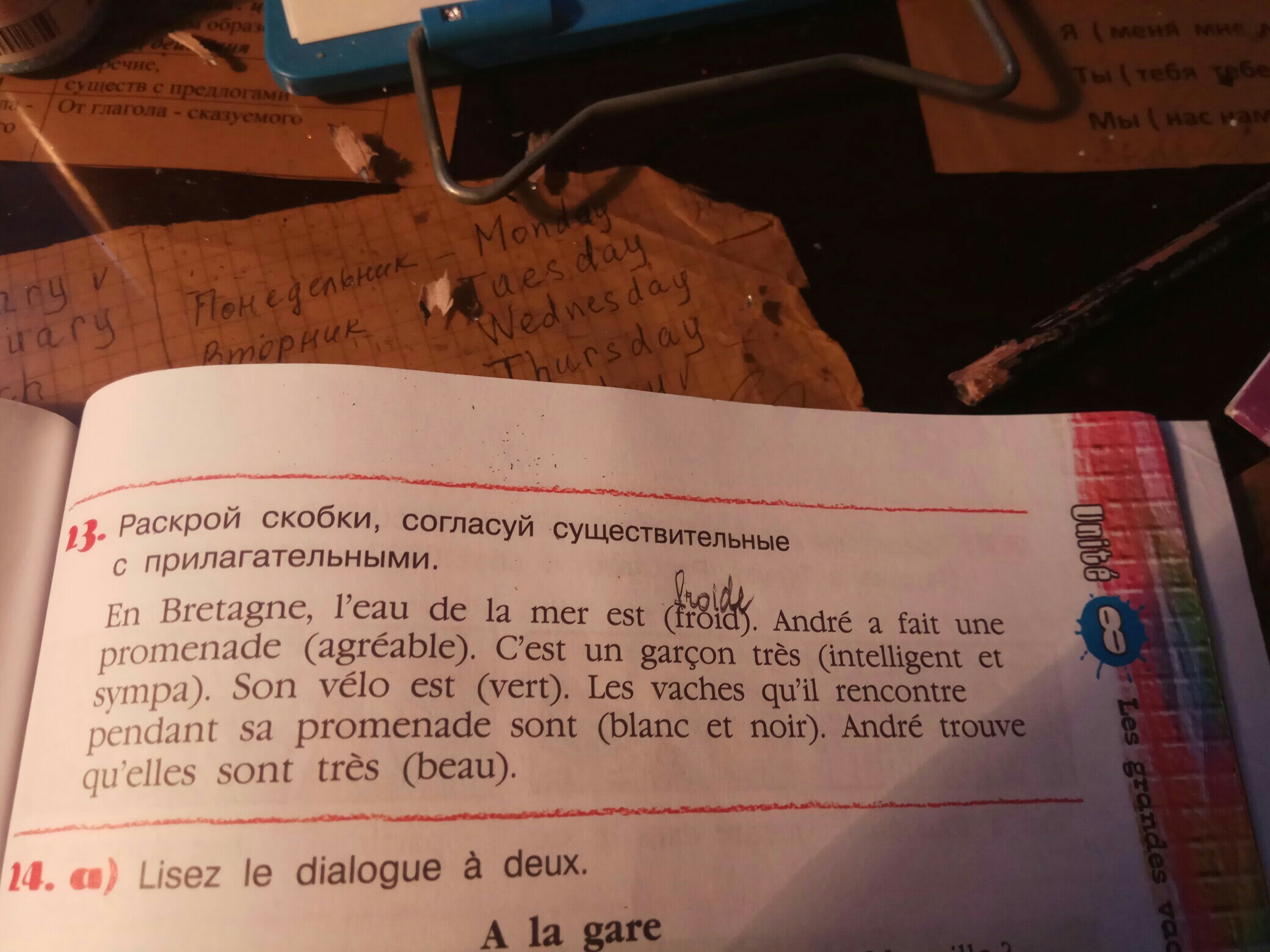 En Bretagne l'eau de la mer est froide. André a fait une promenade agréable. C'est un garçon très intelligent et sympa. Son vélo est vert. Les vaches qu'il rencontre pendant sa promenade sont blanches et noires. André trouve qu'elles sont très belles.