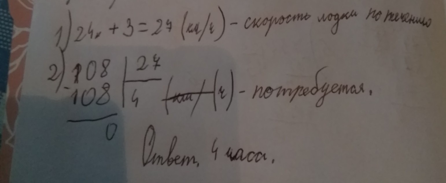 Сколько времени потребуется для того , чтобы проплыть на моторной лодке 108 км по течению реки если её собственная скорость 24 км/ч а скорость течения реки 3 км /ч