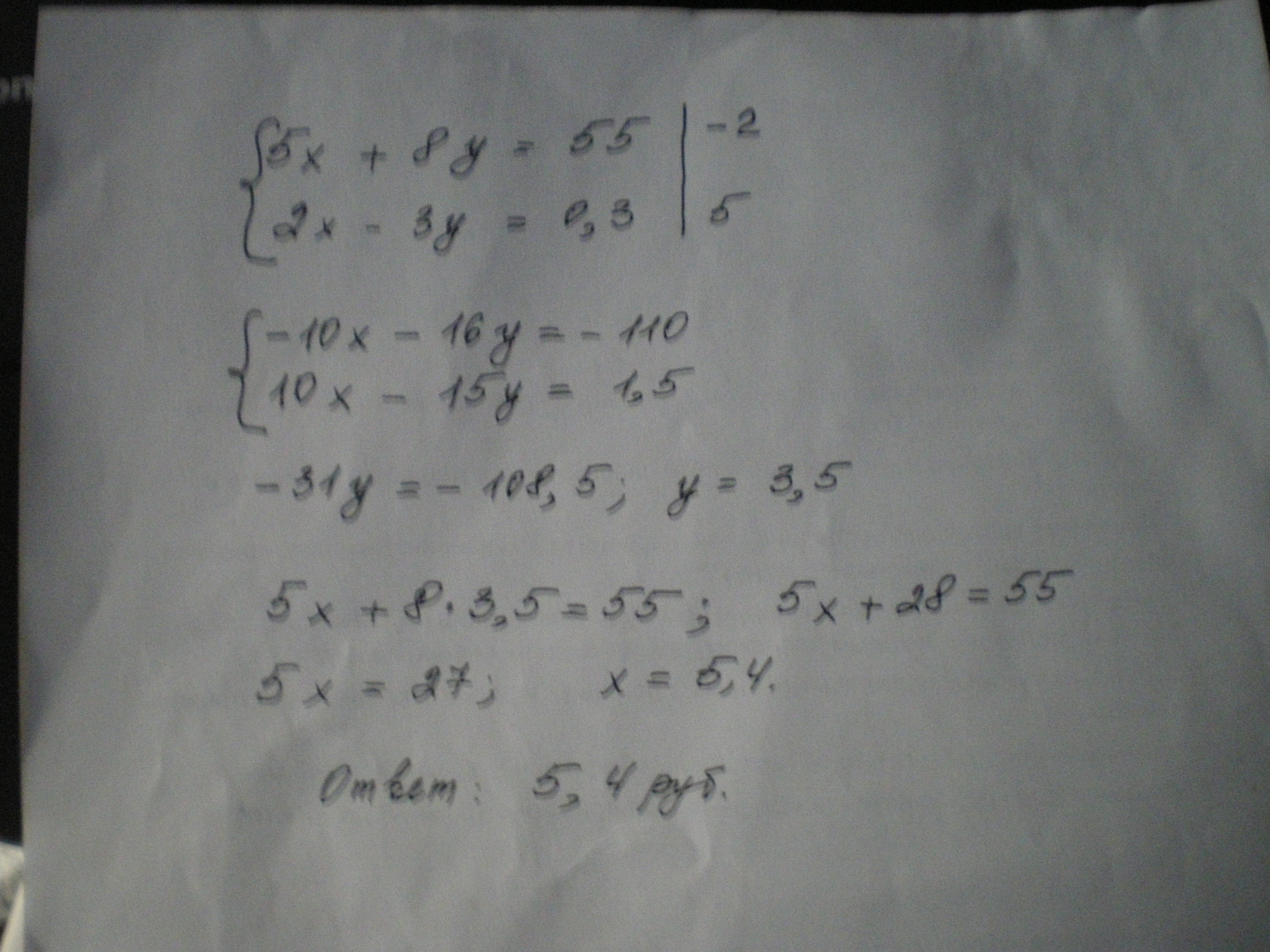 Для школьного кружка приобрели 5 наборов шахмат и 8 наборов шашек на сумму 55 р. Сколько стоит один набор шахмат, если 2 набора шахмат стоят на 30 к. дороже, чем 3 набора шашек? (решить с помощью системы линейных уравнений)
