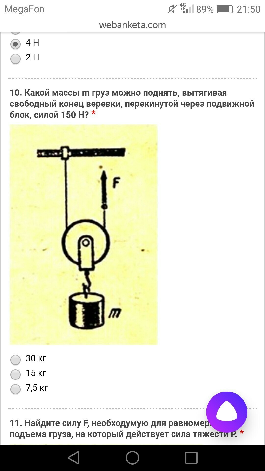 10. Какой массы m груз можно поднять, вытягивая свободный конец веревки, перекинутой через подвижной блок, силой 150 Н? *