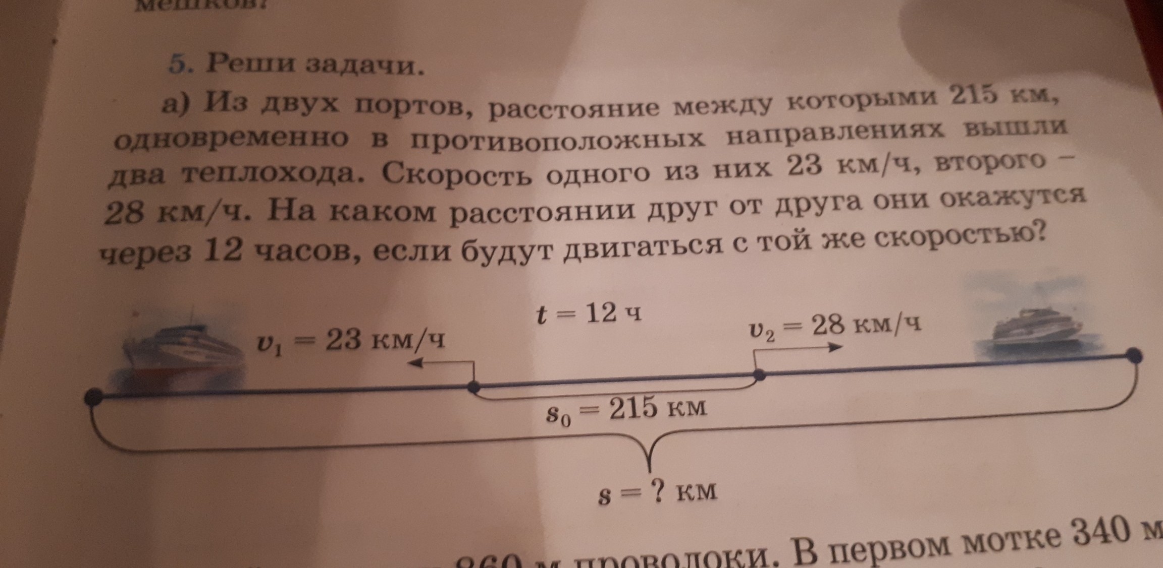 из 2 портов расстояние между которыми 215 км одновременно в противоположных направлениях вышли два теплохода Скорость одного из них 23 км ч а второго 28 км ч На каком расстоянии друг от друга Они окажутся Через 12 часов Если будет двигаться с той же скоростью