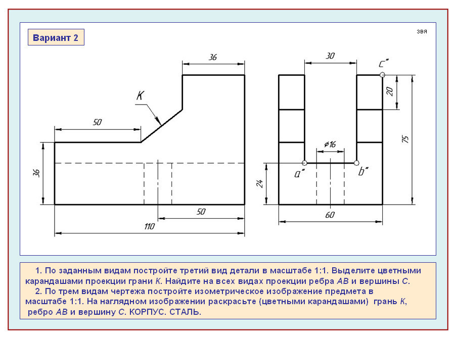 Помооогите! нужно преобразовать главный вид, во фронтальный разрез,построить вид сверху и потом построить аксонометрическую проекцию