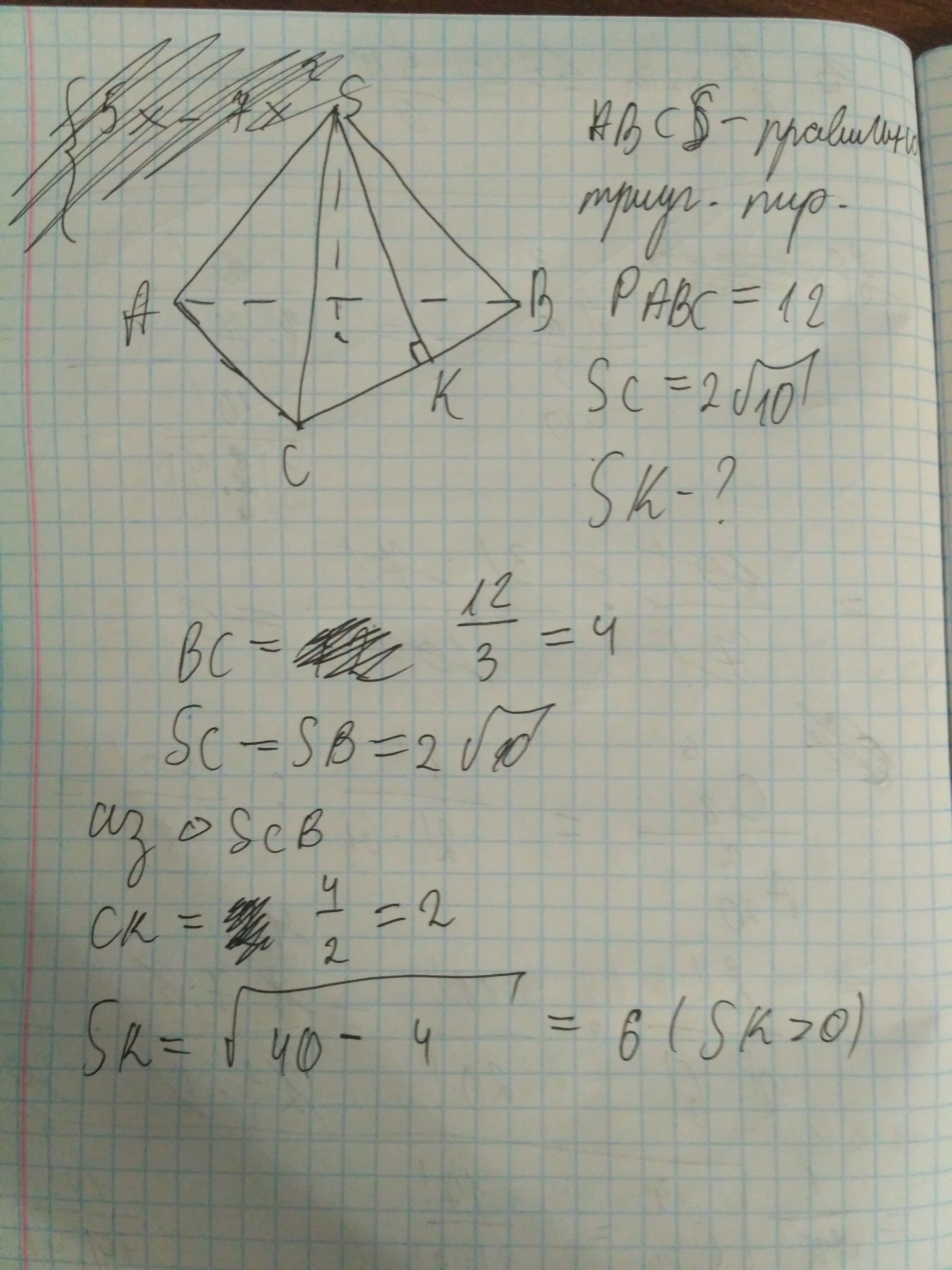 помогите пожалуйста. Периметр основи правильної трикутної піраміди дорівнює 12см. Обчислити апофему піраміди, якщо бічні ребра дорівнюють 2√10 см.