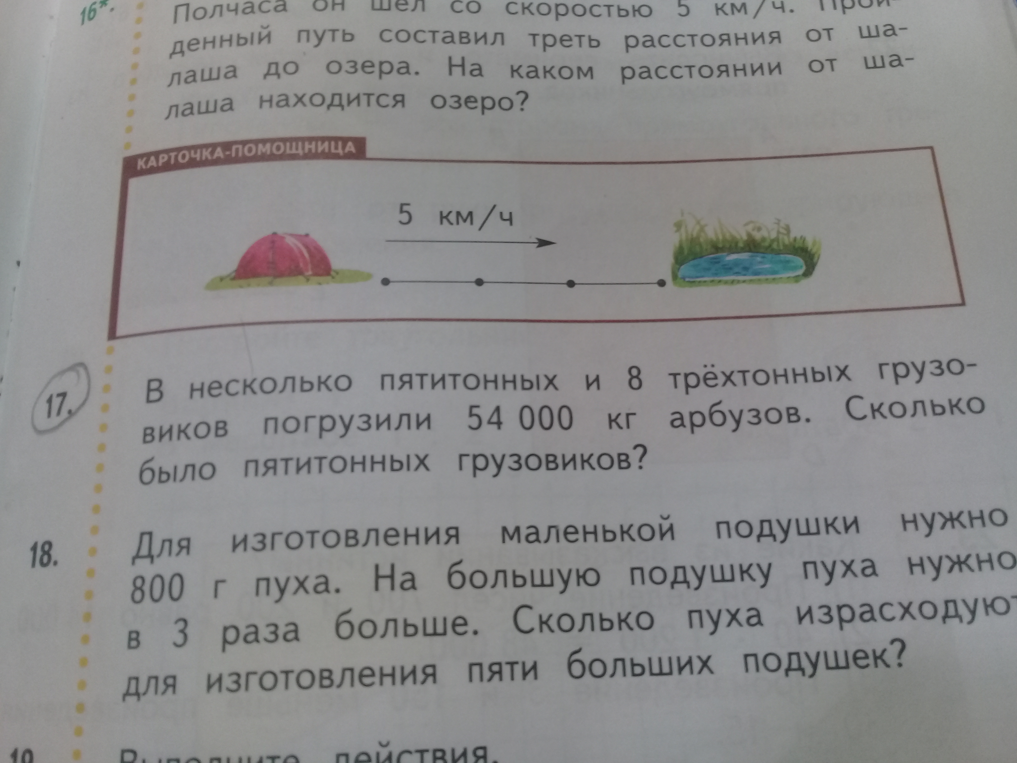 В несколько пятитонных и 8 трёхтонных грузовиков погрузили 54000 кг арбузов.Сколько было пятитонных грузовиков? Пожолуйста пишите решение задачи и действия.ЗАРАНИЕ СПАСИБО номер 17.