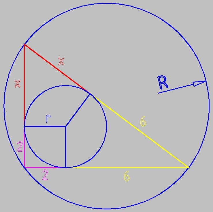 точка касания вписанной окружности делит катет прямоугольного треугольника на отрезки 2см и 6см считая от вершины прямого угла. найдите радиусы описанной и вписанной окружностей