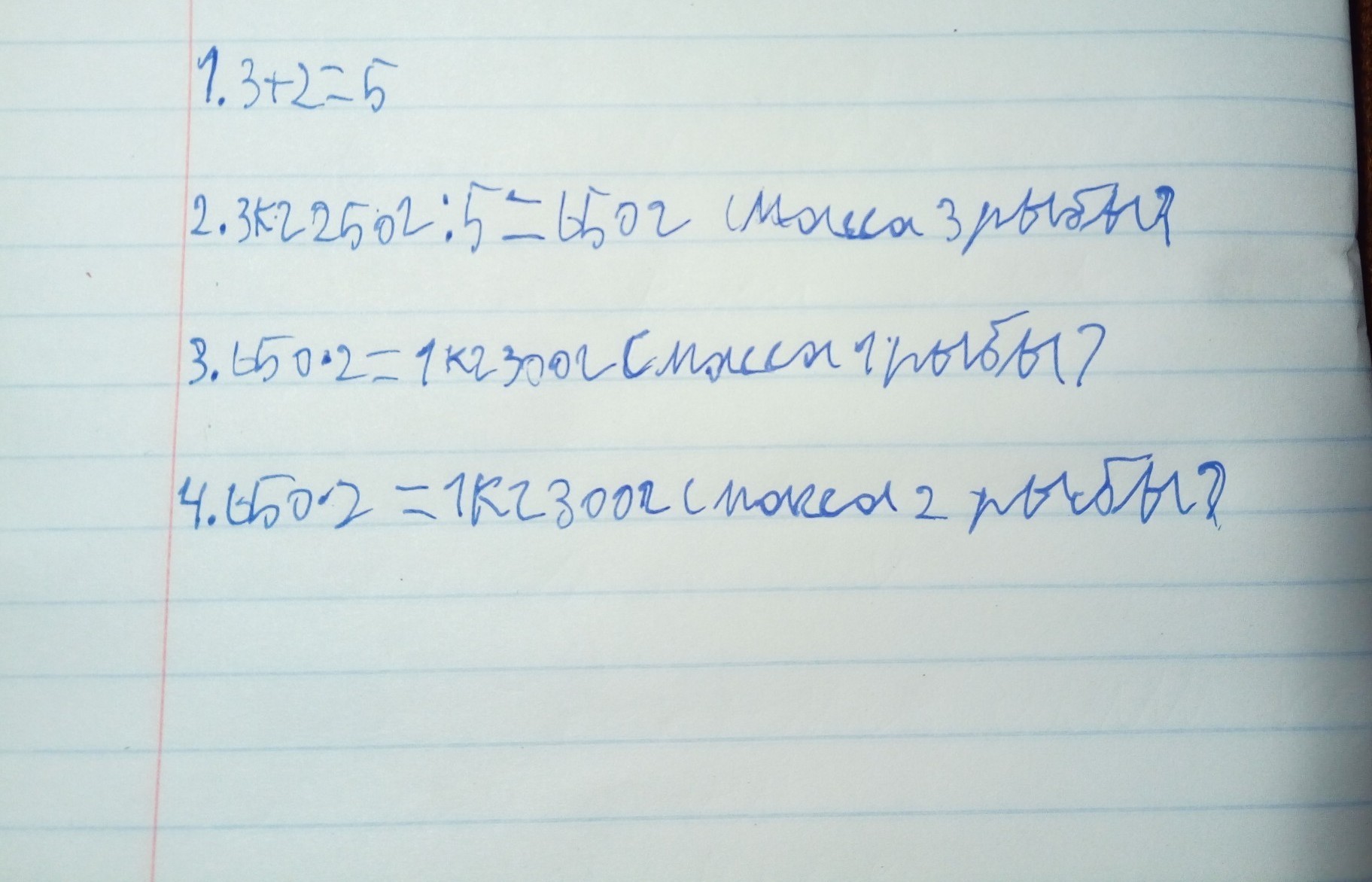 3250/5*2=1300 гр - масса 1 рыбы как и 2-й по отдельности