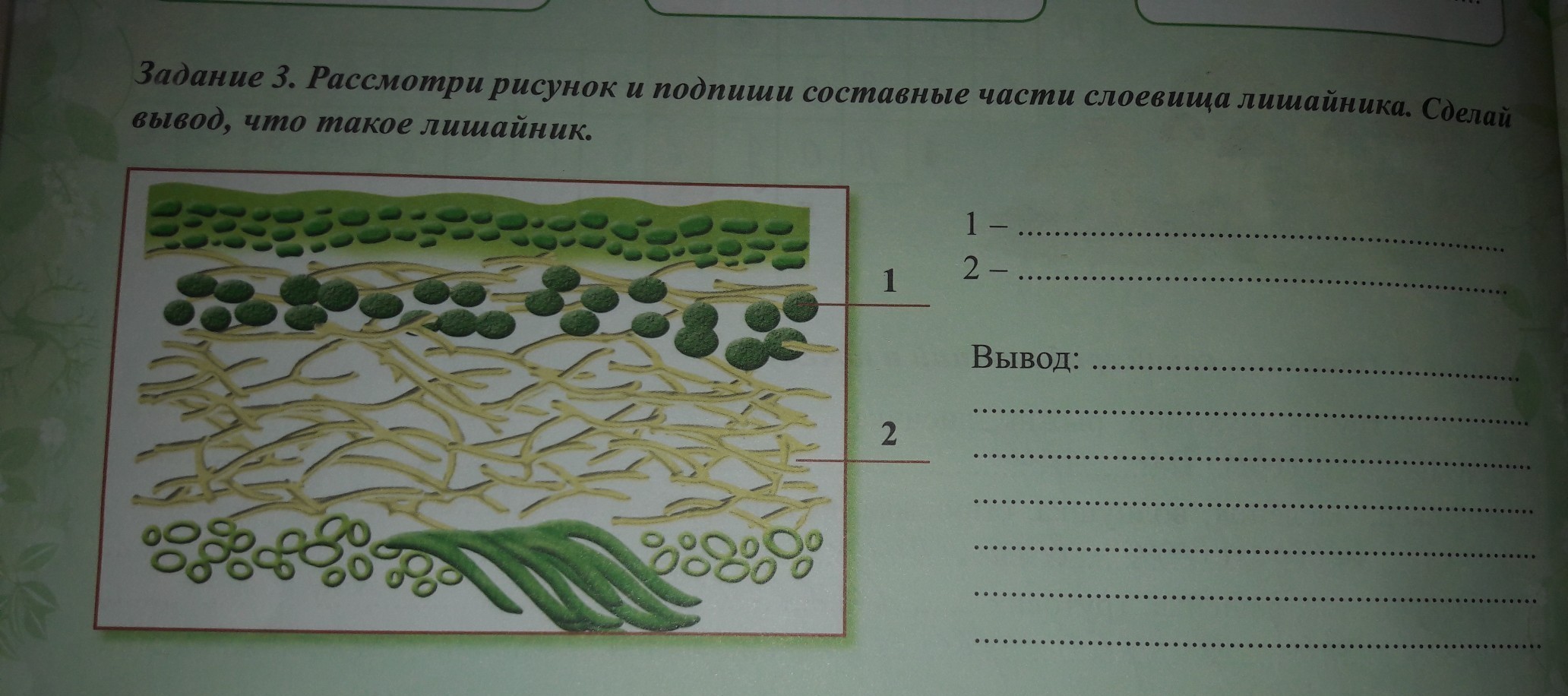 рассмотри рисунок и подпиши составные части слоевища лишайника. сделай вывод, что такое лишайник.