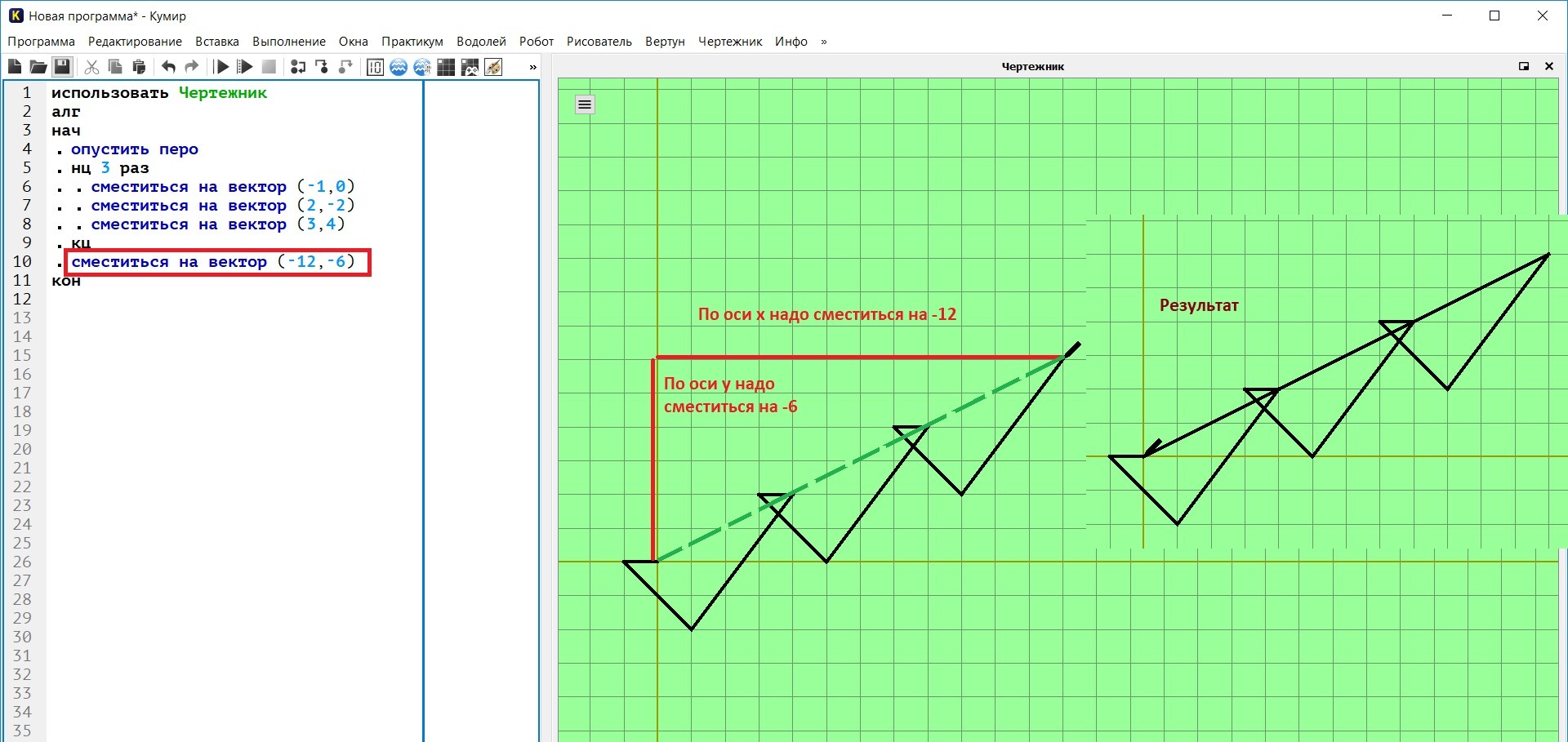 Например, если Чертёжник находится в точке с координатами (7, 3), то команда Сместиться на (3, −1) переместит Чертёжника в точку (10, 2).