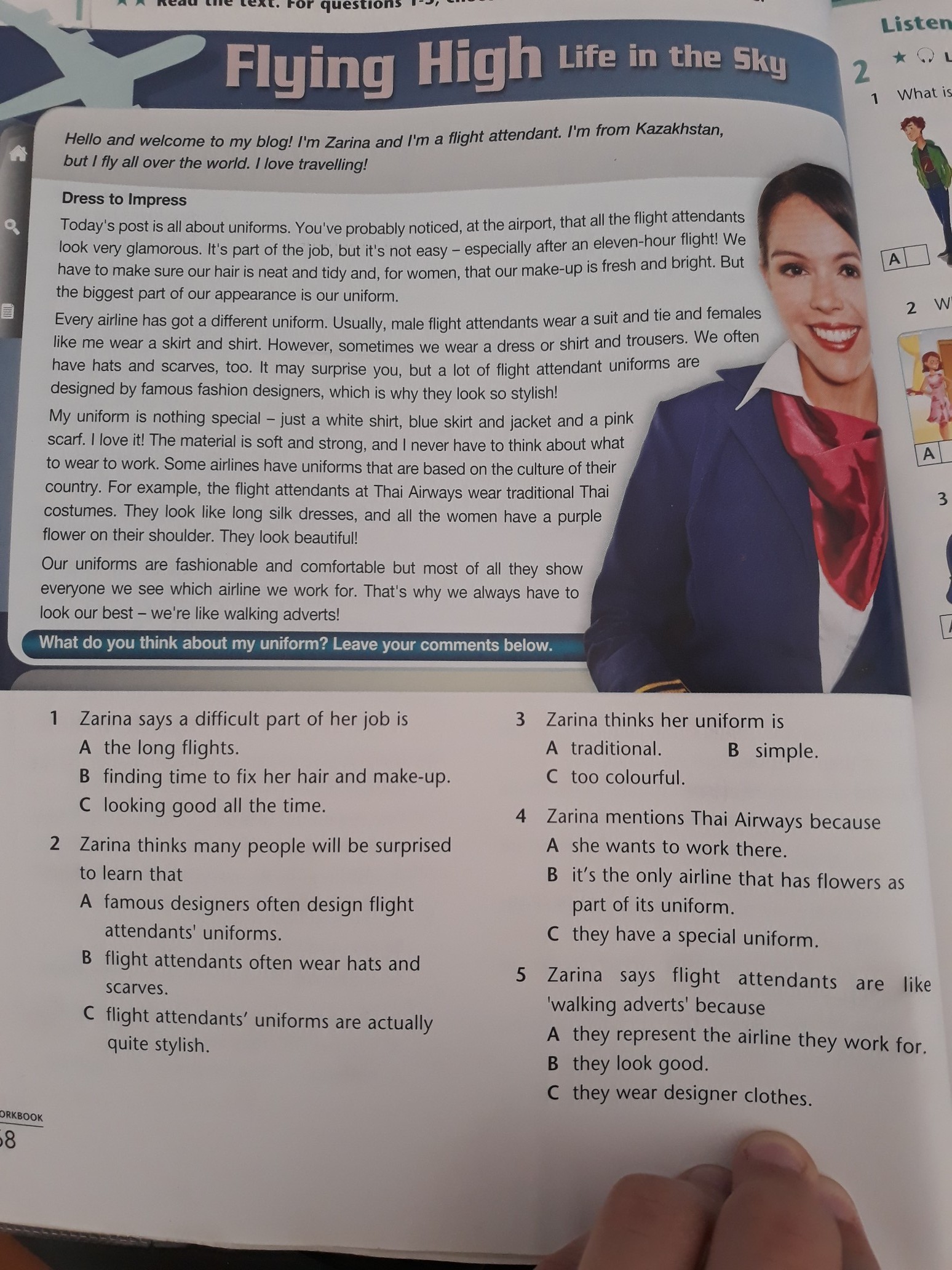 2 Zarina thinks many people will be surprised to learn that A famous designers often design flight attendants' uniforms.3 Zarina thinks her uniform is B simple.